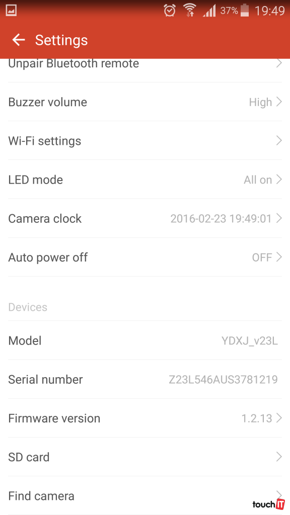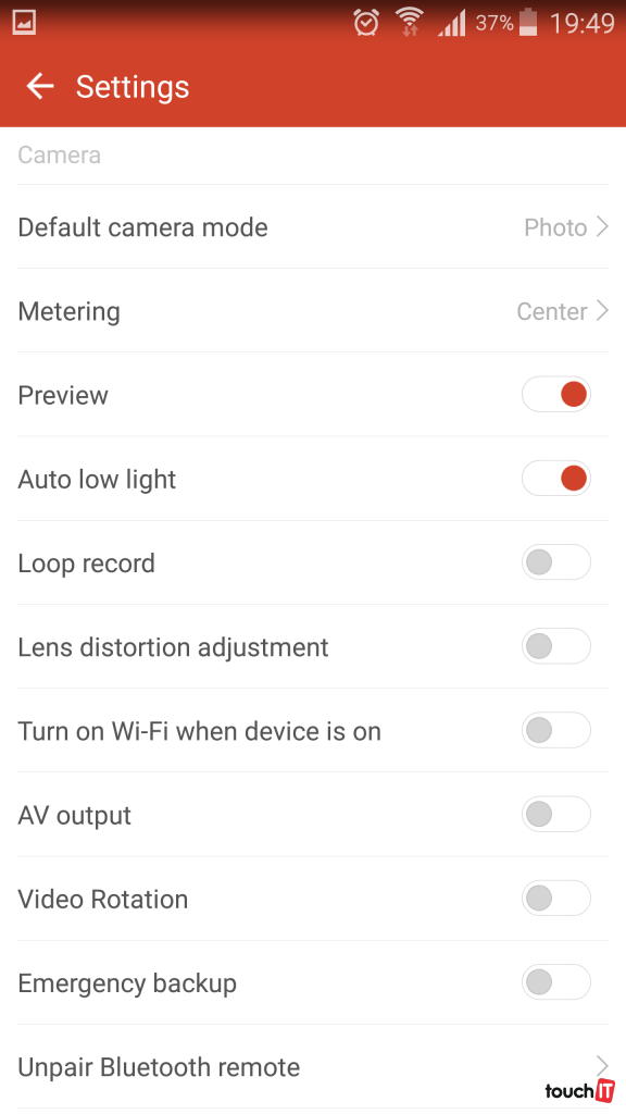 Kamera má na oplátku nevýhodu oproti konkurentom, že nedisponuje žiadnym displejom pre ukážku aspoň nastavených preferencií. Všetky pokročilejšie nastavenia je možné regulovať len pripojením k smartfónu pomocou wifi. Ale aj v týchto nastaveniach nám chýbajú niektoré možnosti ako ISO, vyváženie bielej a pod.