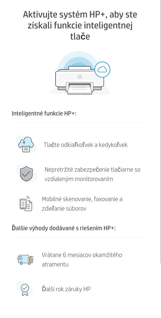 Výber plánu závisí od počtu vytlačených strán do mesiaca. Podrobnosti o službe HP+ nájdete tu. Dôležité pritom je, že sa dá ušetriť až 50 % nákladov na atrament. Pokiaľ sa rozhodnete pre službu HP+, získate celých šesť mesiacov predplatného služby Instant Ink a celý rok záruky HP navyše pri použití originálneho atramentu HP. Službu pritom môžete kedykoľvek zrušiť a vrátiť sa ku klasickému nakupovaniu originálnych atramentových kaziet HP.