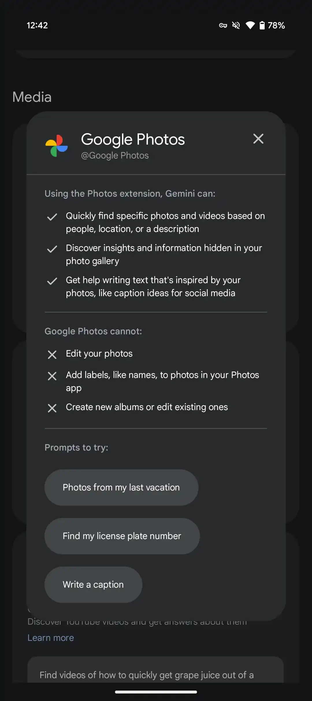 V prípade aplikácie na zálohovanie fotografií, novinka používateľom umožňuje vyhľadávať svoje zálohované fotografie a videá priamo cez Gemini pomocou rôznych kritérií, ako sú rozpoznané tváre, uložené vzťahy, miesto alebo dátum vzniku snímky, popis obsahu alebo aktuálna konverzácia v aplikácii. Používatelia si budú môcť prepojiť Gemini s účtom Google Fotiek a následne vyhľadávať konkrétne snímky.