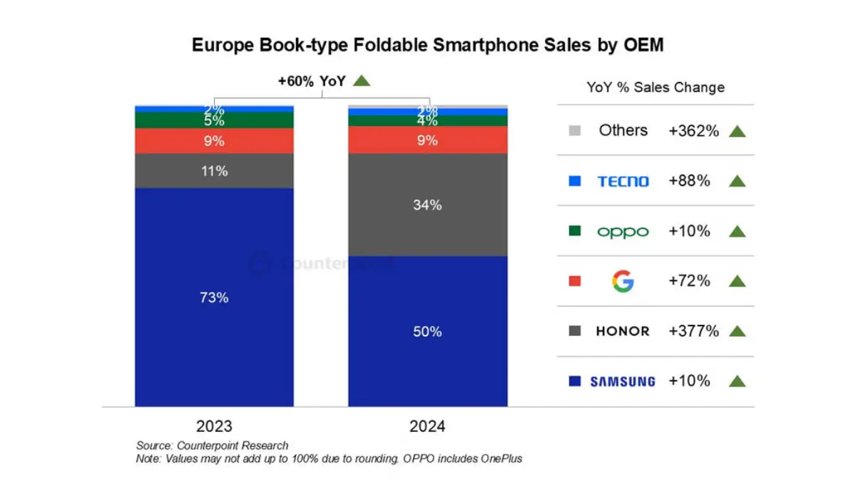 V roku 2024 tak Samsung predal až 50 % zo všetkých skladacích telefónov v Európe. Podiel tejto značky sa však znížil zo 73 % aj napriek tomu, že medziročne predali o 10 % telefónov viac. Znamená to teda, že záujem o skladacie telefóny stále rastie, dôležitá je ale aj diverzita medzi značkami. Úspech tak zaznamenal HONOR, ktorý v roku 2024 predal o 377 % telefónov viac.