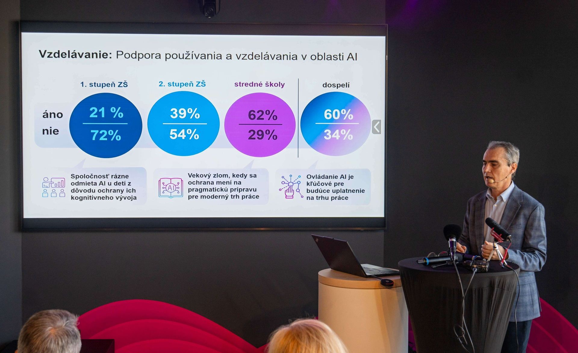 Hoci sa vzdelávanie ukazuje ako jediná dlhodobá odpoveď, realita je rozporuplná. Väčšina Slovákov odmieta zavedenie AI do výučby na základných školách, pričom podpora rastie až na vyšších stupňoch.