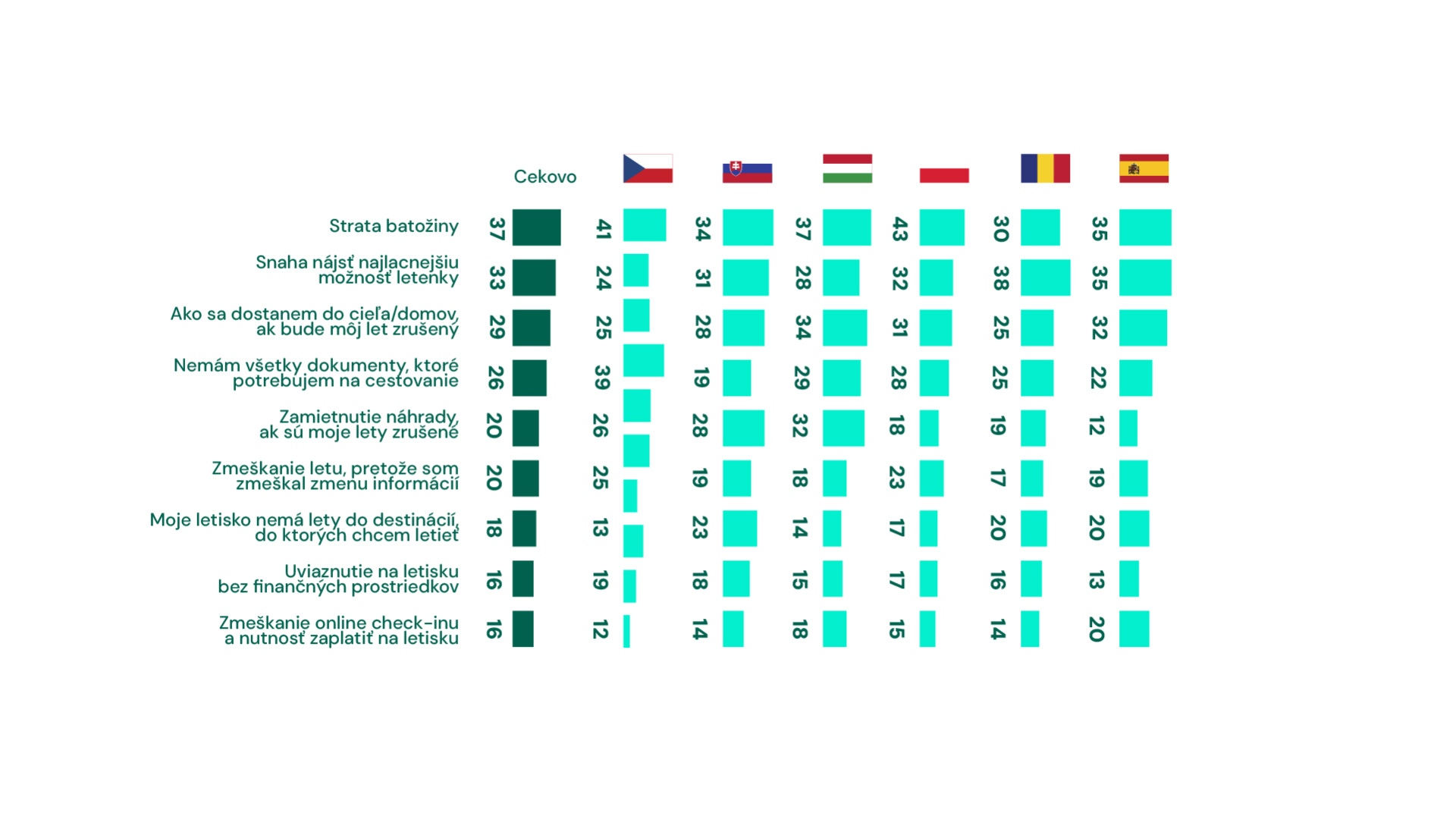 Najväčším zdrojom stresu pre Slovákov v súvislosti s cestovaním je obava zo straty batožiny, ktorú uviedlo 34 % respondentov. Medzi ďalšie stresujúce faktory patrí snaha nájsť najlacnejšiu letenku (31 %), obavy ohľadom zabezpečenia návratu domov pri zrušení letu (28 %) a strach z nedostatočnej alebo žiadnej refundácie v prípade zrušeného letu (28 %). Pokles z minuloročných 37 % môže byť pri poslednom spomenutom zdroji spojený s rastúcim povedomím o službe Kiwi Guarantee, ktorá klientom Kiwi.com poskytuje rýchlu kompenzáciu pri zrušených letoch.