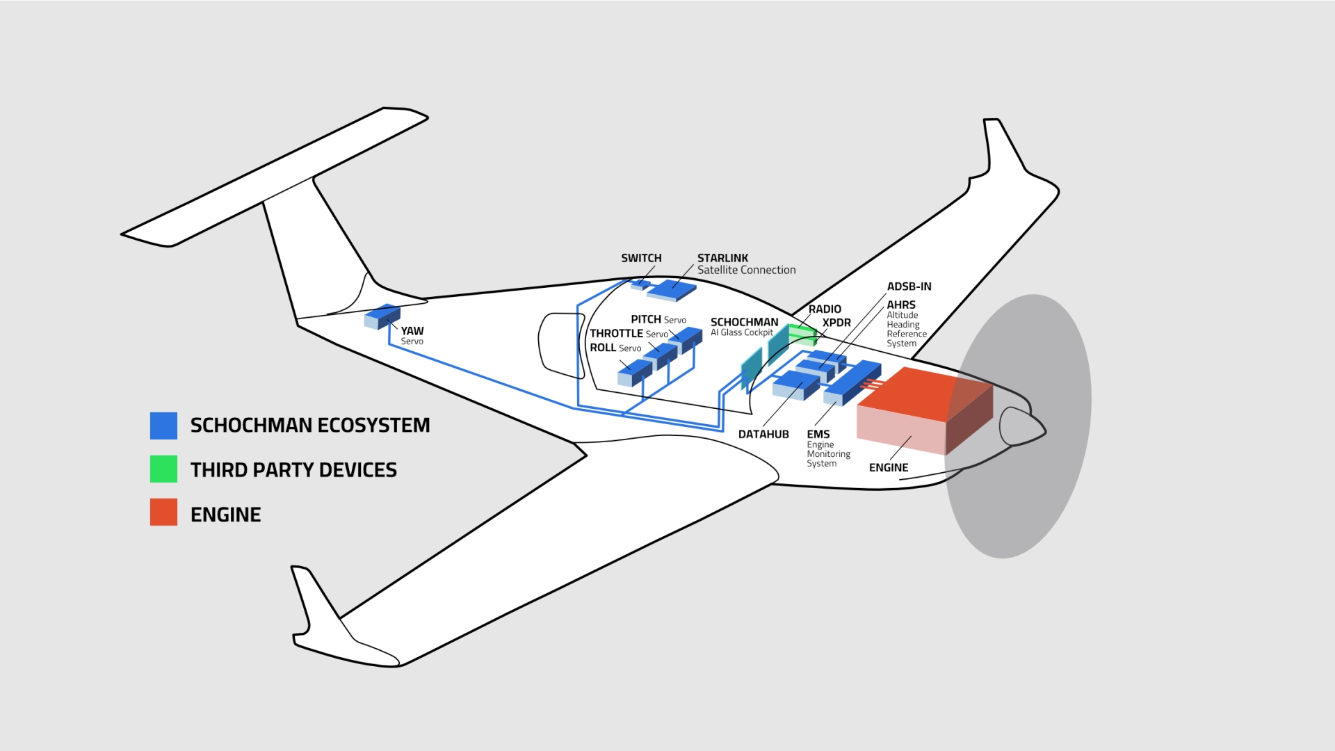 Väčšie dopravné lietadlá disponujú radarovými systémami, no pri menších športových lietadlách nie je takyto radar k dispozícii. Piloti sa spoliehajú na rôzne aplikácie alebo manuálne hľadanie informácií, čo je obzvlášť náročné v oblastiach bez internetového pokrytia. Schochman AI Glass Cockpit tento problém rieši integráciou satelitného spojenia, vďaka čomu zobrazuje detailné počasie vo vysokom rozlíšení a v reálnom čase – kdekoľvek na svete, v akejkoľvek výške.