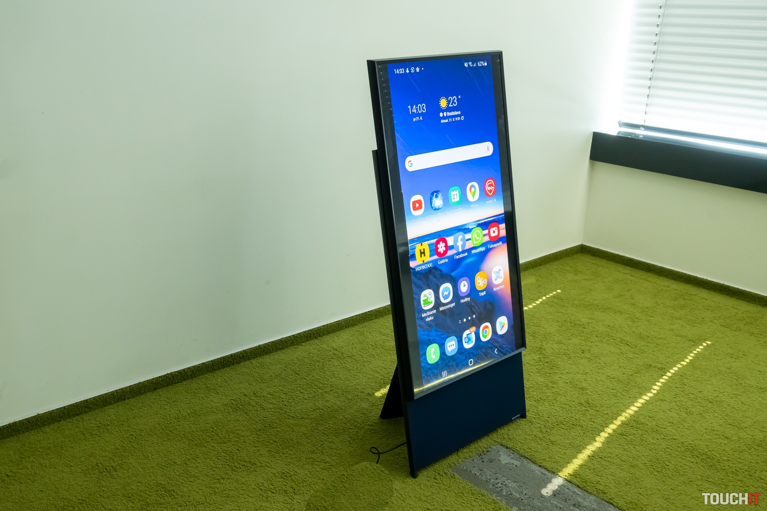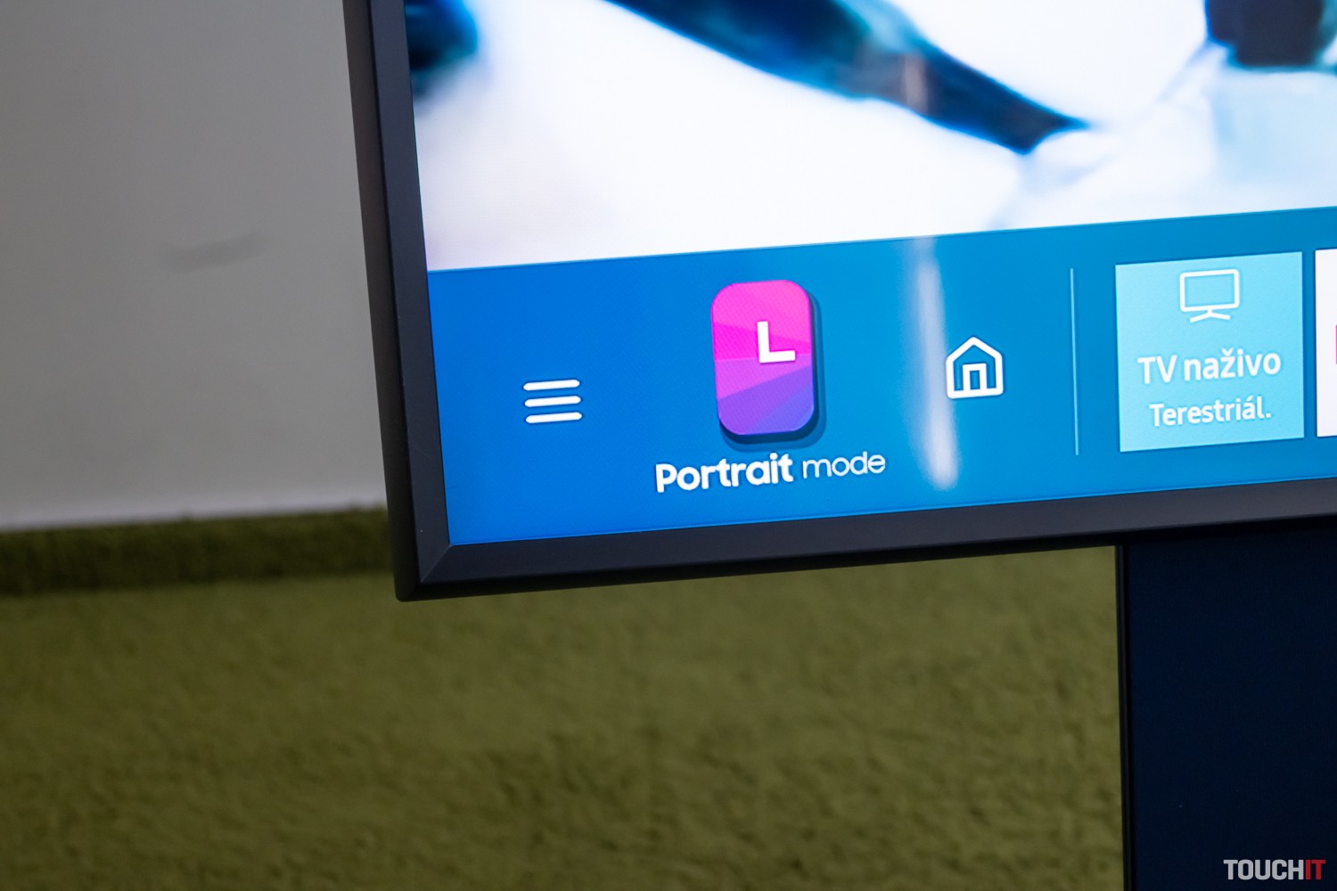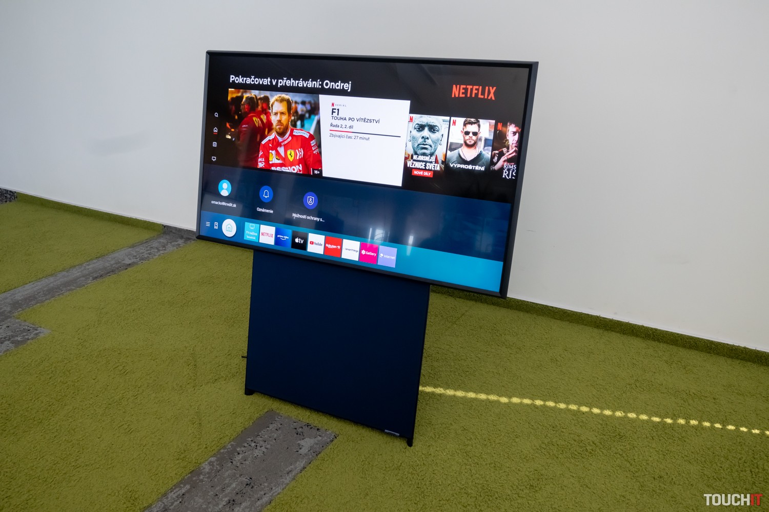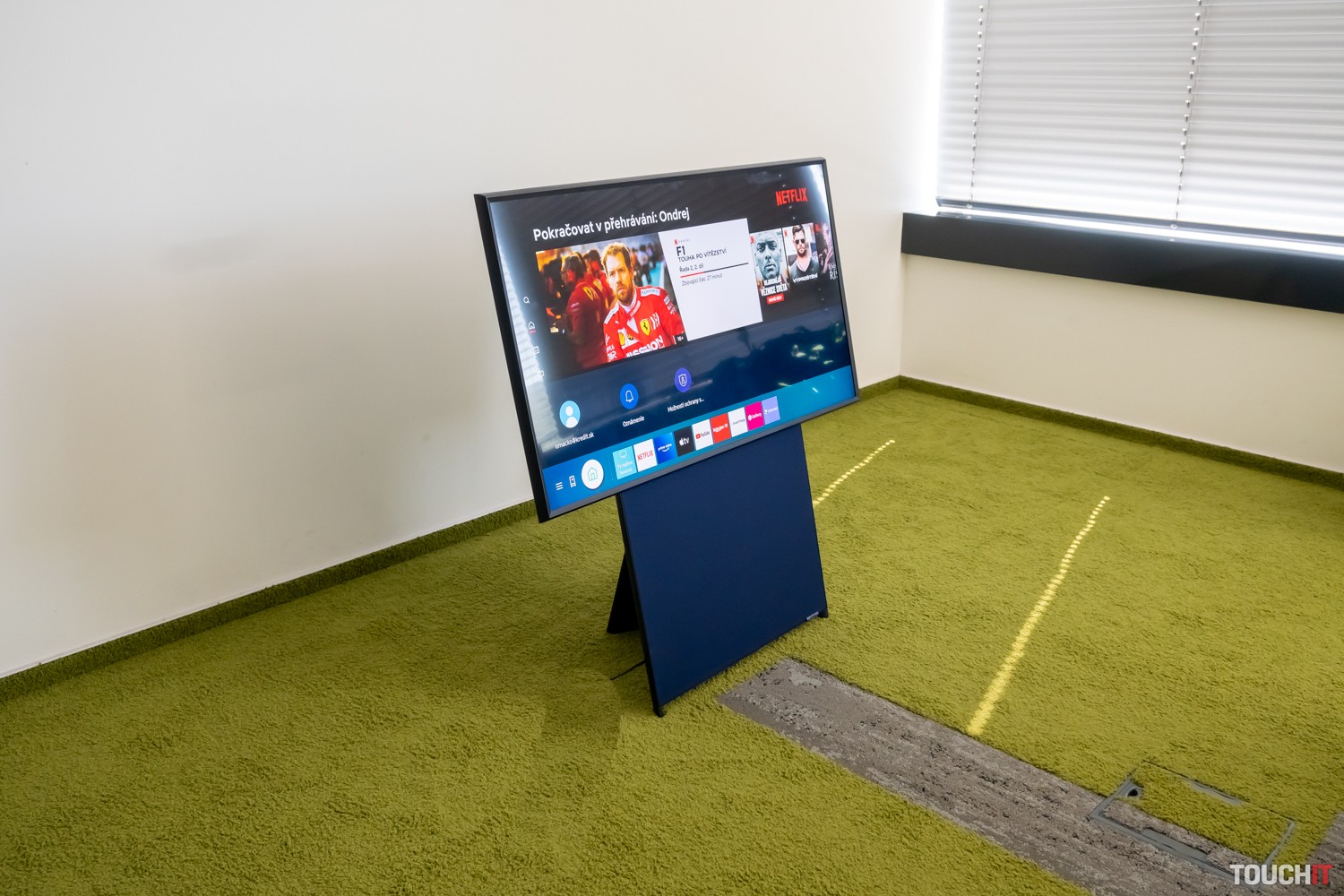 Jeho základnou charakteristikou je práve otočná obrazovka. Tento televízor nepotrebuje osobitný stojan, pri montáži sa prichytáva len oporná noha. Ak chcete, televízor je možné jednoduchšie premiestňovať po miestnosti pomocou zabudovaných koliesok. Tie sa dokupujú osobitne. Testovali sme model s označením Samsung QE43LS05T, ktorý má uhlopriečku 43 palcov, čo je 109 cm.