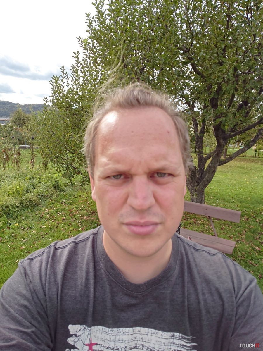 Predný fotoaparát má rozlíšenie 13 Mpx a 5-osovú stabilizáciu obrazu. Fotky tváre však neboli vždy ostré. Fotoaparát v niektorých prípadoch preferoval zaostrenie objektov za nami, hoci našu tvár správne detegoval. Odporúčame preto skontrolovať výsledné snímky a prípadne zhotoviť fotografiu opäť. So správnym zaostrením produkuje predný fotoaparát detailné snímky s výborným farebným podaním. Novinkou je tiež špeciálny režim selfie portrétu, ktorý dokáže softvérovo rozostriť pozadie a zjemniť pokožku na tvári. Všetko si môžete nastaviť.