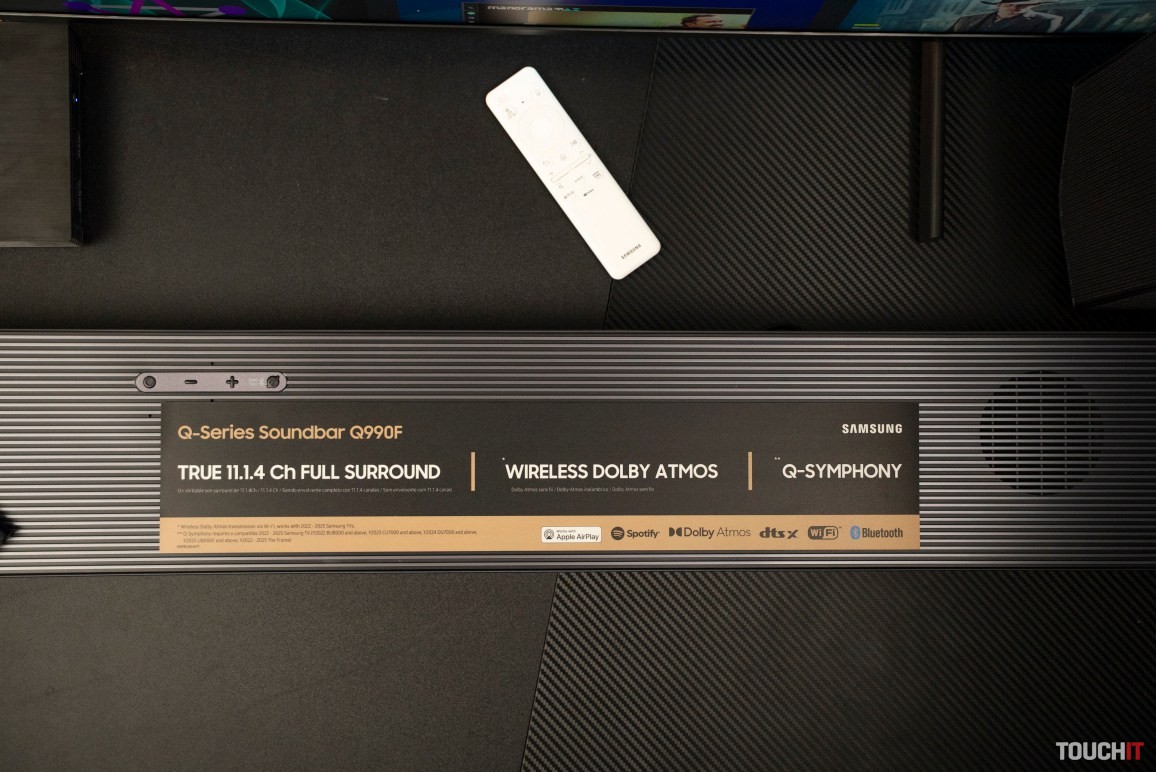 HW-Q990F od Samsungu je vrcholom jej ponuky v tejto oblasti. Je to soundbar v režime 11.1.4 a jednotlivé reproduktory sú prepojené bezdrôtovo. Je to 11 predných kanálov, 1 basový a 4 vertikálne a zadné kanály.