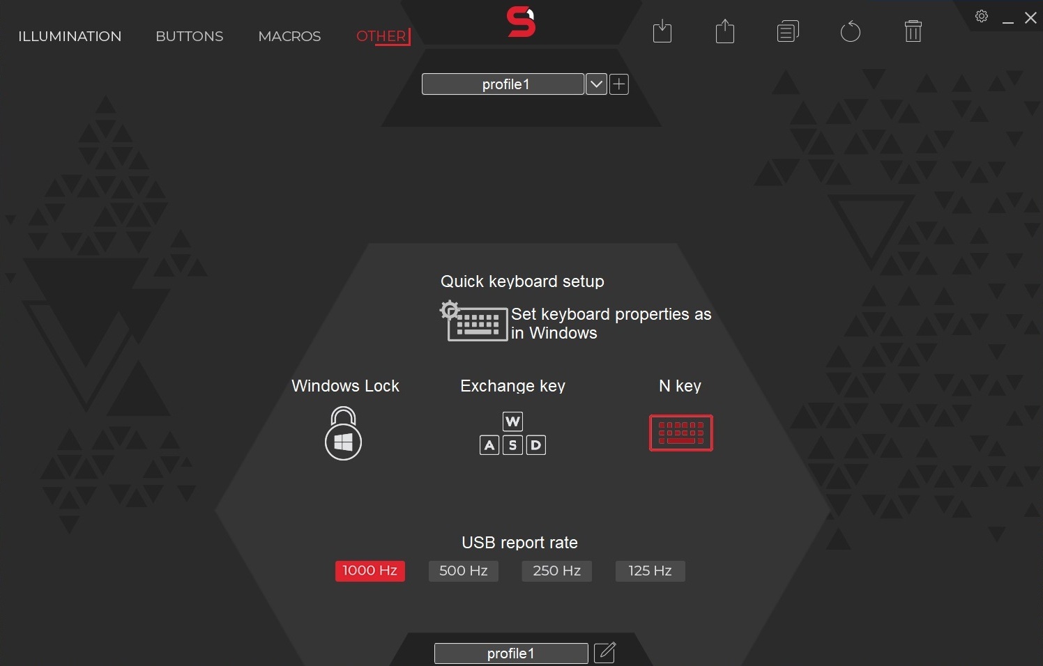 Po nainštalovaní softvéru získa hráč prístup k širokému spektru užitočných funkcií. Aj keď ide skôr o základné možnosti nastavenia klávesnice, tie používateľom umožňujú nastaviť typ RGB podsvietenia, jeho farbu, režim efektu, oneskorenie, ako aj vytvárať používateľské profily. Okrem toho ľahko použiteľný sprievodca makrami umožňuje uložiť zložité príkazy pod jednu klávesu.