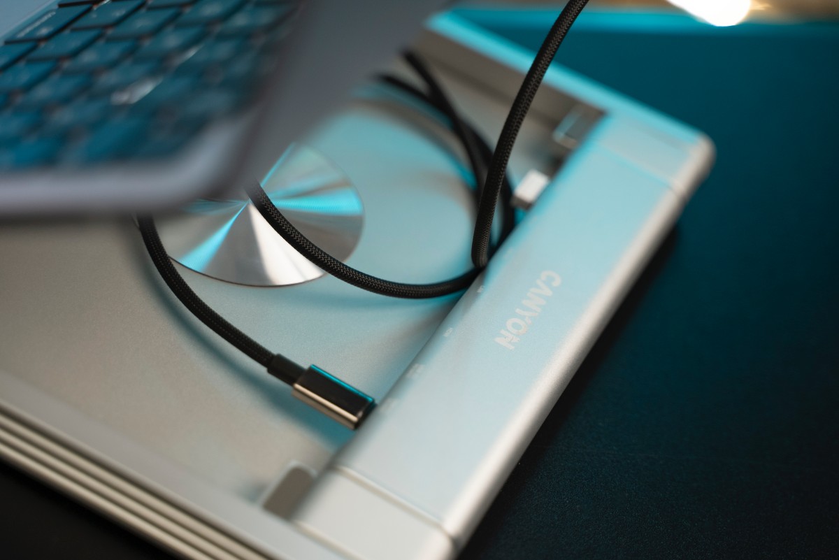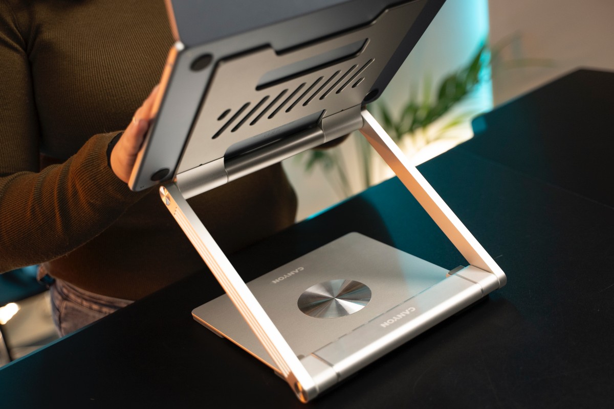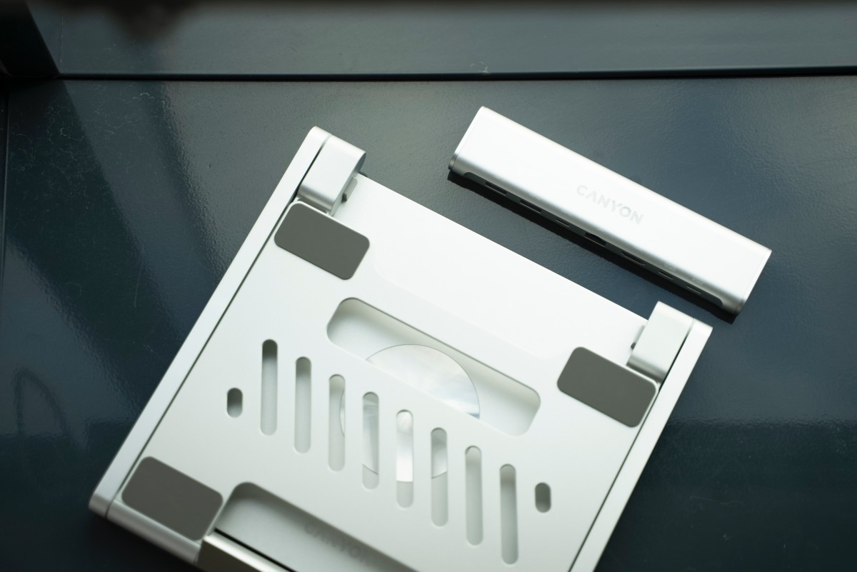 Stojan na notebook Canyon OnStand 2 spája ergonómiu s multifunkčným pripojením. Je navrhnutý pre každého, kto chce od svojho notebooku dostať viac a vylepšiť tak svoj pracovný priestor. Má otočnú základňu s rozsahom 360°, čo je využiteľné napríklad na pracovných stretnutiach, pri potrebe nastavenia uhla pohľadu či v mnohých ďalších situáciách. Je skladací, takže sa jednoducho prenáša a vďaka magnetickému odnímateľnému rozbočovaču dokáže udržať káble usporiadané. Rozbočovač dokáže premeniť jeden USB-C vstup na HDMI, Ethernet port a mnoho ďalšieho. Ponúka USB porty pre rýchly prenos súborov a 100 W nabíjanie typu PD.