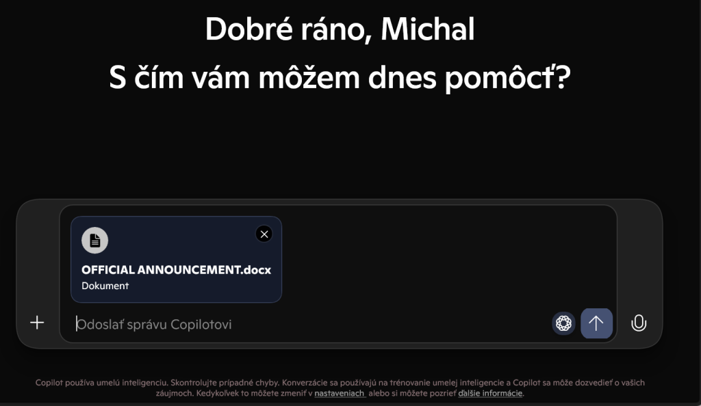 Odosielanie funguje aj vtedy, keď nie je aplikácia spustená. Príkaz Spýtaj sa Copilota ju spustí a súbor korektne vloží. Na ďalšiu analýzu nepotrebujete zadávať žiaden príkaz. Stačí potvrdiť vloženie súboru klávesom Enter alebo tlačidlom na analýzu (tlačidlo šípky nahor). Následne sa zobrazí sumarizácia toho, čo sa v súbore nachádza. Po zadaní konkrétnej požiadavky sa dá so súborom detailnejšie pracovať.