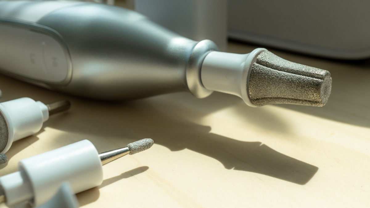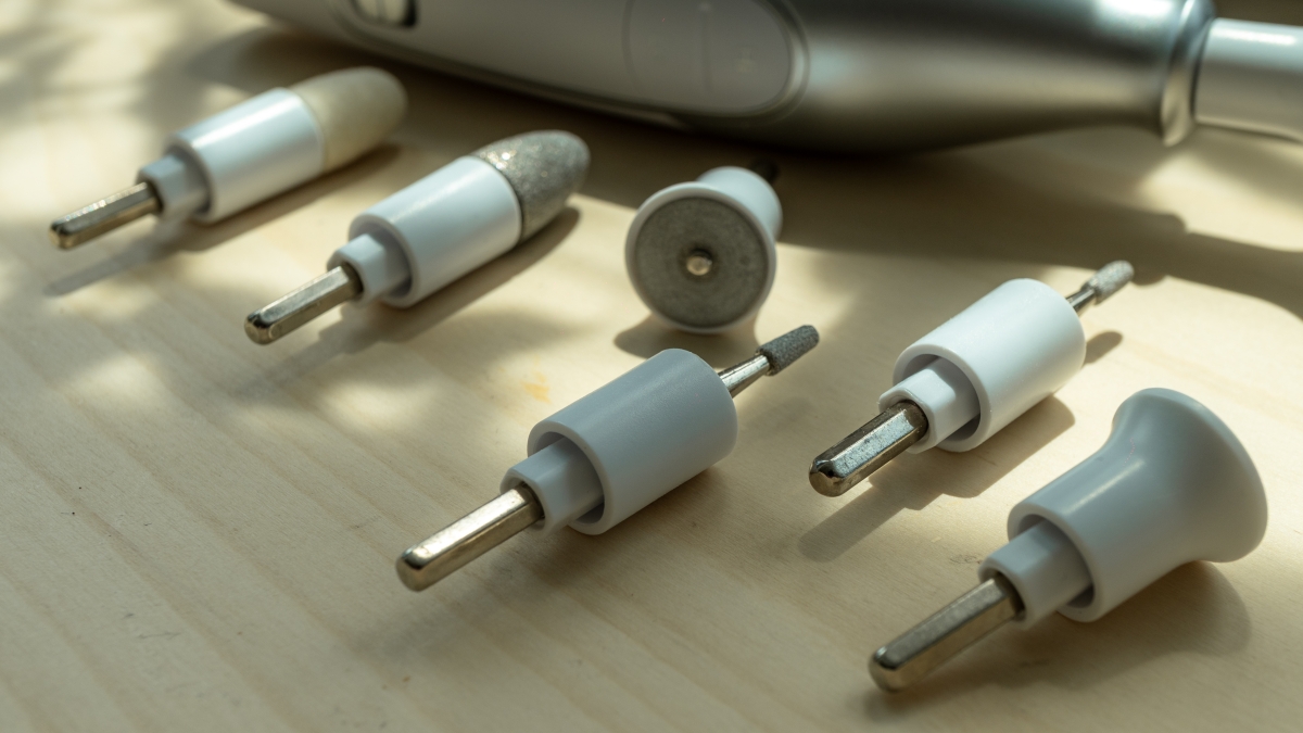 K samotnému prístroju je okrem praktického cestovného púzdra a nabíjačky, pribalených až 7 kvalitných nadstavcov zo zafíru či plsti a ochranný kryt, ktorý zabraňuje šíreniu čiastočiek zbrúsenej kože. Každý z nadstavcov má vlastné určenie (zafírový kotúč jemný a hrubý – na brúsenie a opracovávanie nechtov, zafírový kužeľ – na ostránenie mozoľov a zhrubnutej kože na chodidlách a pätách, plstený kužeľ – na leštenie nechtov, zafírová brúska – na zrohovatenú kožu chodidiel, valcová fréza – na odstránenie skôrnatených povrchov nechtov, fréza v tvare plameňa – na zarastené nechty).