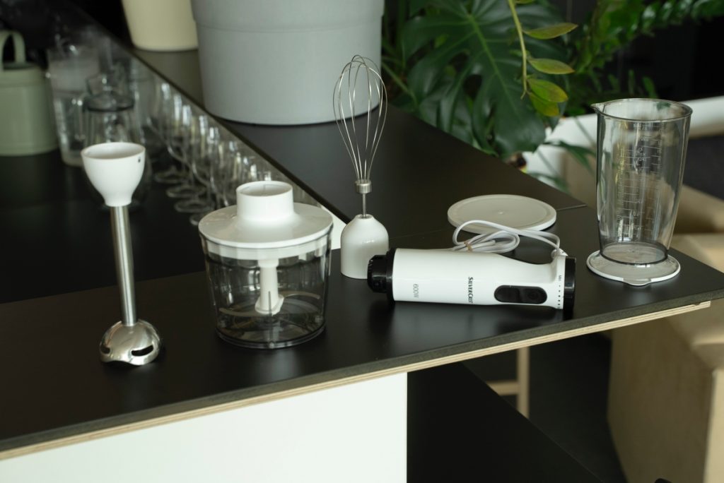 Súčasťou balenia mixéra je nádobka na sekanie, nádobka na šľahanie, šľahač a tyčový sekáčik s dizajnom špeciálne prispôsobeným aj na výrobu pyré. Nádobka na sekanie má objem 500 ml a dvojčepeľový nôž. Zvládne posekať orechy aj tvrdý syr. Nádobka na šľahanie môže slúžiť zároveň ako odmerka s kapacitou 700 ml. Dĺžka prívodového kábla je 1,5 metra a váha samotného mixéra je približne 630 gramov.