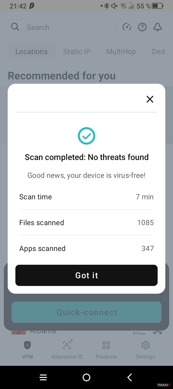 Antivírus funguje aj na Androide. Aplikácia Surfshark, ktorú si stiahnete na pripojenie vášho Androidu k VPN sieti, obsahuje v samostatnej sekcii aj antivírus. Ten beží na pozadí a umožňuje ochranu v reálnom čase. Nechýba ani automatická denná kontrola alebo kontrola úložného priestoru. V prípade potreby sa dajú nastaviť vylúčené aplikácie. To sú aplikácie, ktoré nebudú programom preverované.