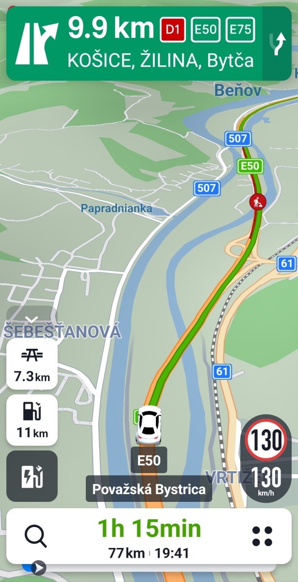 Na spodku obrazovky je informačná lišta, v ktorej pribudli čas a vzdialenosť zostávajúce do cieľa, ale aj údaj o meškaní v minútach. Os s priebehom cesty je teraz zrozumiteľnejšia vďaka modrej šípke v aktuálnej pozícii na trase. Farebne sú na nej odlíšené úseky so zdržaním, aby ste mali prehľad v reálnom čase počas jazdy.