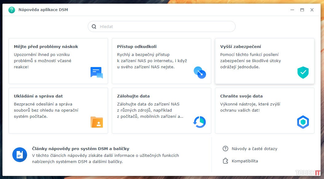 K zrozumiteľnosti prispieva aj štruktúrovaná nápoveda, ktorá je rozdelená do 6 základných oblastí plus existuje nápoveda pre jednotlivé balíčky. Mimoriadne rýchle je aj prostredie základnej aplikácie (balíčka) File Station. Pomocou nej sa dá prehliadať na úrovni súborov obsah na NAS diskoch a realizovať súborové operácie vrátane vzdialeného prístupu. Aj pre tento balíček platí, že je rádovo rýchlejší ako je to v prípade verzie DSM 6.2 a celé prostredie je v DSM 7 prehľadnejšie a vzdušnejšie.