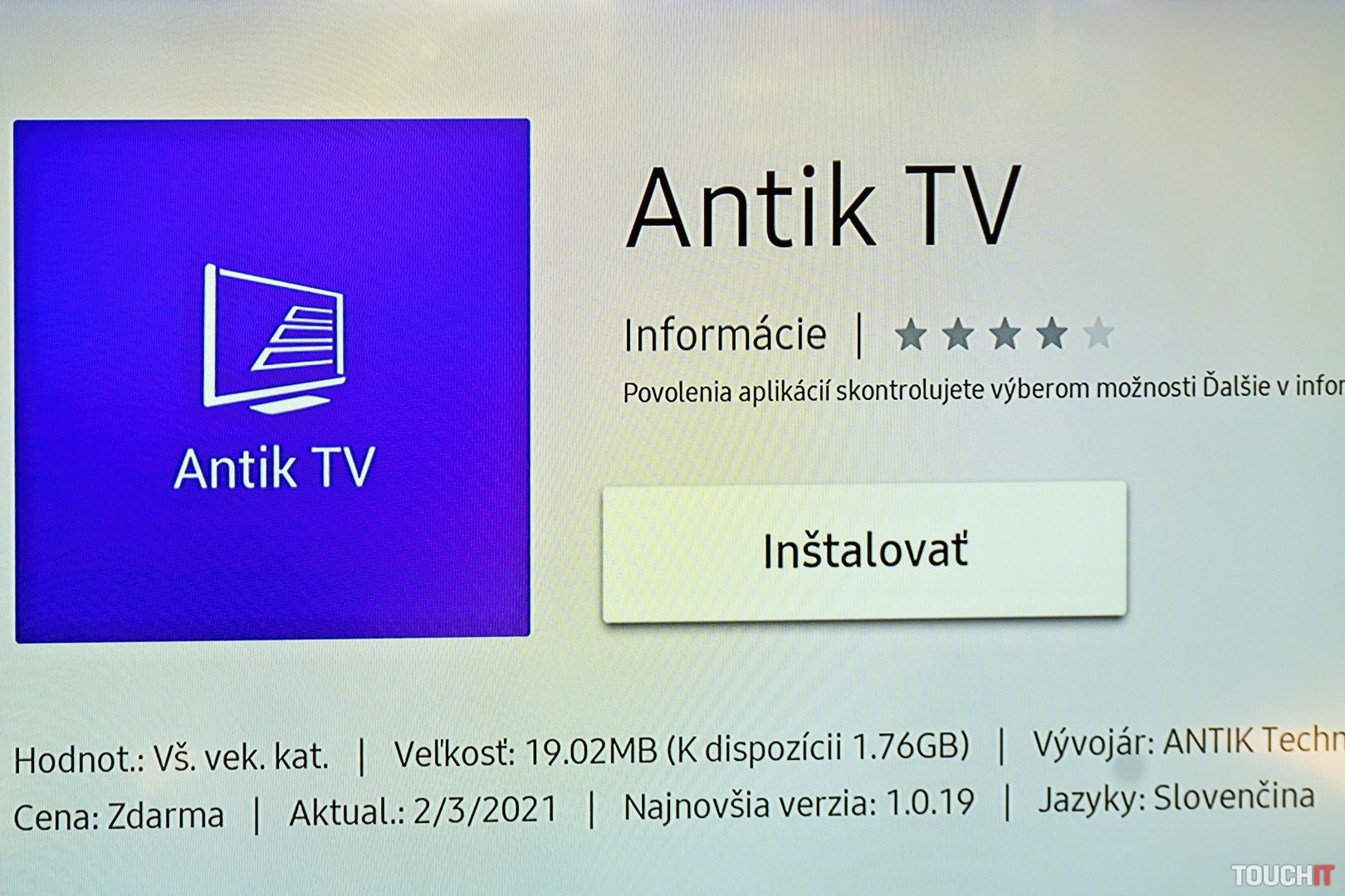 Inštalácia je veľmi jednoduchá. Zobrazíte si na televízore prostredie na vyhľadanie aplikácií a napíšete Antik. Následne vám aplikáciu vyhľadá a nainštalujete si ju. Hneď potom sa dá aj spustiť a sledovať aj bez toho, aby ste sa registrovali. Odporúčame vám ale registrovať sa, máte potom viac možností. Tiež si môžete vybral jazykové prostredie aplikácie. Inštalácia je hotová do 30 sekúnd.