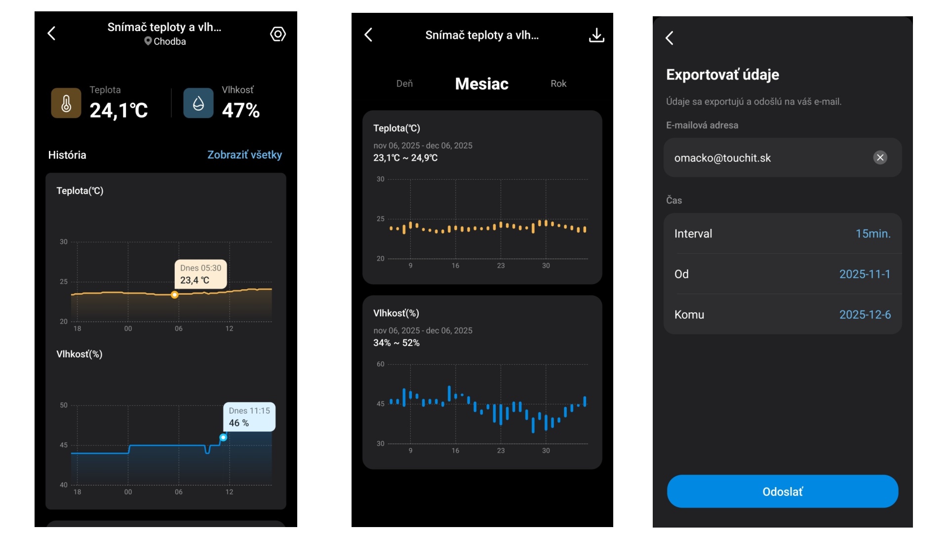 Výrobca ponúka až dvojročné ukladanie nameraných údajov a to zdarma. To je v tejto kategórii príjemný bonus. väčšinou je ukladanie do cloudu spoplatnené. V Tapo aplikácii si pozriete prehľadné grafy a dáta môžete navyše exportovať do CSV súboru. Tým získate možnosť dlhodobej analýzy, čo je užitočné napríklad pri riešení problémov s vlhkosťou. Export je opäť zdarma a funguje tak, že si ho pošlete na zvolenú mailovú adresu. Toto je aj cesta ako dostať dáta z mobilného zariadenia a spracovať ich na počítači. Priame meranie dát z počítača nie je možné, na meranie sa používa mobilná aplikácia. Namerané dáta si ale pozriete aj vzdialene, stačí vám len pripojenie na internet.