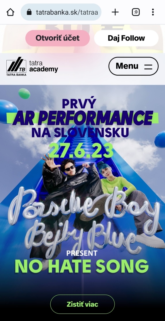 Najnovším počinom Tatra banky je koncert No Hate Song v rozšírenej realite. Ideálne je, ak si ho pozriete na Hodžovom námestí v Bratislave, kde sa koncert uskutočňuje aj so zakomponovaním nedávno rekonštruovanej fontány.