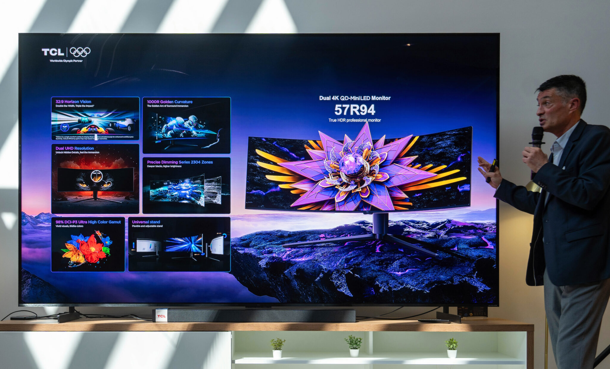 Samostatnú kapitolu v ponuke tvoria monitory. TCL ukázalo aj extrémne riešenia, vrátane 57-palcového zakriveného monitora, ktorý dokáže rozdeliť obraz na dve plnohodnotné 4K plochy.