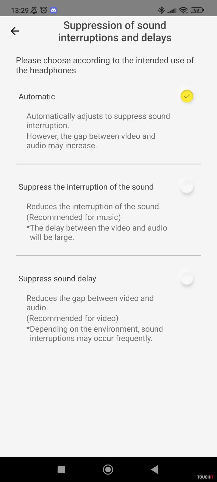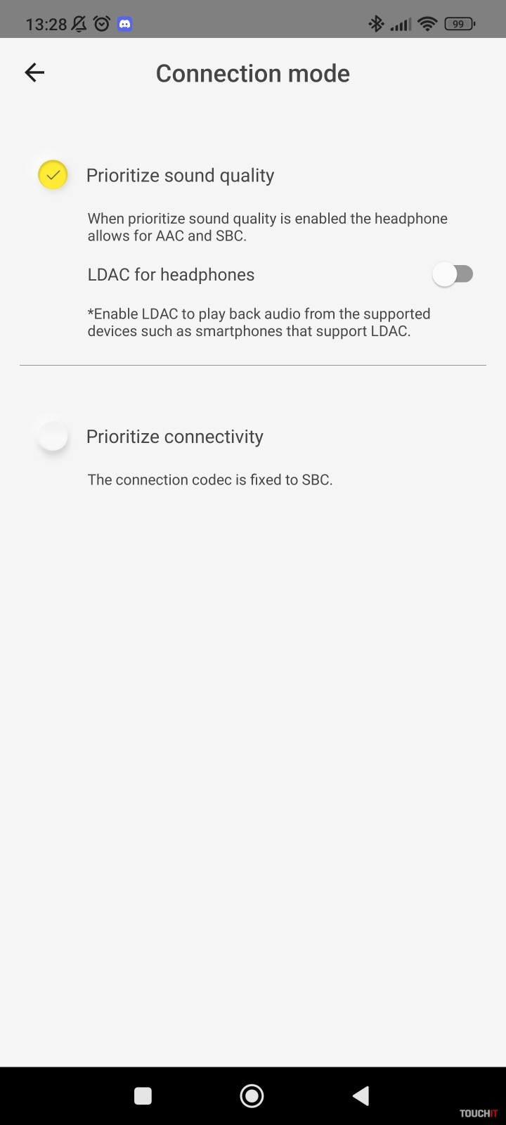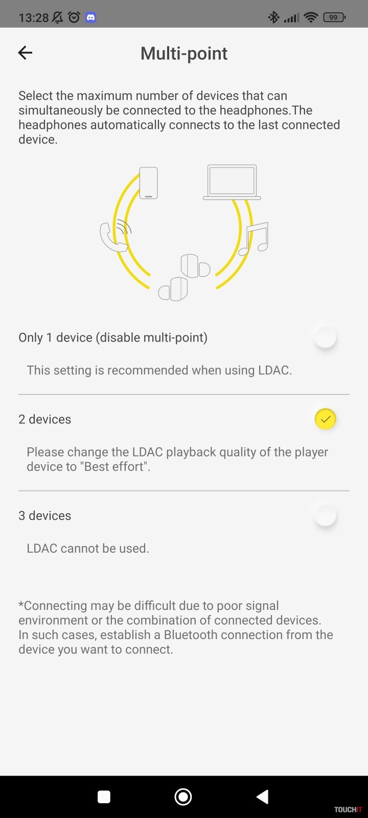 Aplikácia ďalej umožňuje prepínať režim slúchadiel, pričom práve tu sa dá nastaviť použitie kodeku 96 kHz/24-bit LDAC. Vtedy treba počítať s vyššou spotrebou, zhruba na dvojnásobnej úrovni. Slúchadlá bežne vydržia do 7 hodín prehrávania hudby. S LDAC prenosom počítajte s časom približne 4,5 hodiny. Druhou záležitosťou tohto vysokokvalitného zvukového kodeku a odpovedajúceho dátového prenosu je aj to, že nebude umožnené multibodové párovanie. Na to, aby sa dali pripojiť slúchadlá k až 3 zariadeniam naraz, je potrebné použitie tohto kodeku vypnúť.