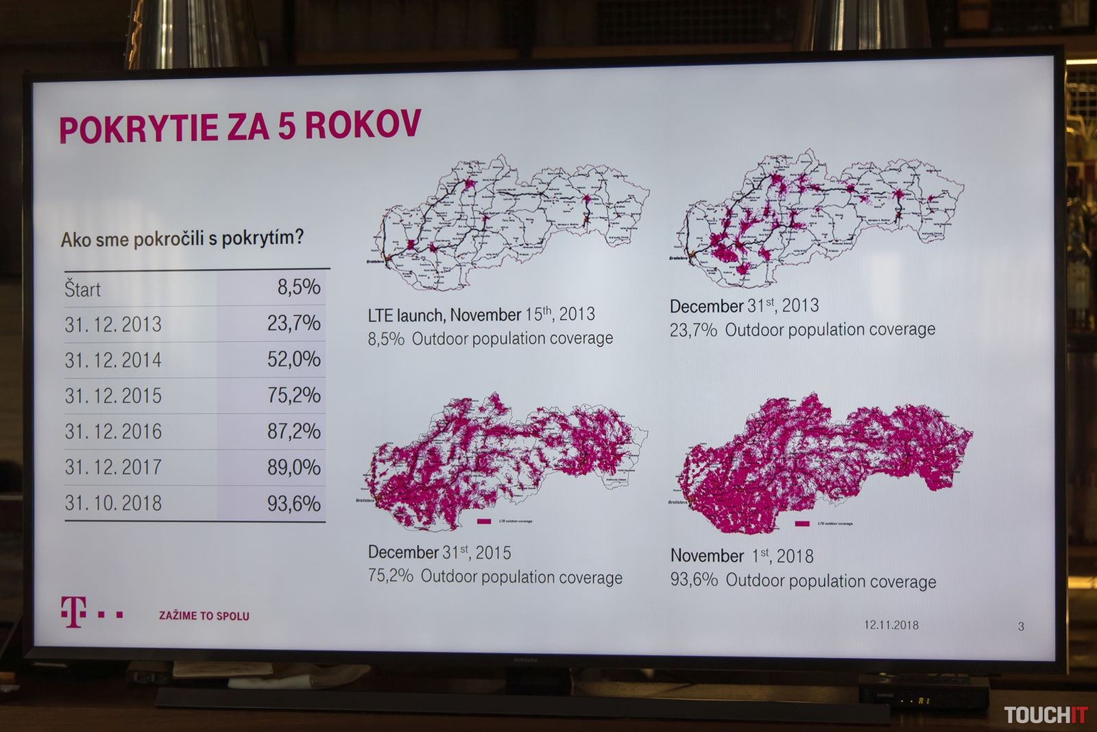 Telekom spustil svoju 4G sieť na Slovensku dňa 15. novembra 2013. Pri štarte pokrýval 8,5% populácie Slovenska, do konca roka 2013 navýšil pokrytie na 23,7%. K 1. novembru 2018 môže jeho 4G sieť využívať 93,6% populácie SR. Počas uplynulých 5 rokov sa menili aj prenosové rýchlosti, ktoré Telekom vo svojej sieti ponúka. Pri štarte dosahoval teoretický download a upload hodnoty 73 / 23 Mbps, v niektorých mestách je to až 500 / 75 Mbps. Špecialitou je Petržalka, kde aktuálne rýchlosť sťahovania dosahuje až 877 Mbps. V Petržalke je použité riešenie 4×4 MIMO. Dôvod, prečo je takto rýchly 4G internet práve v bratislavskej mestskej časti je logický – patrí k najvyťaženejším miestam na Slovensku, keďže 28 z 30 najviac vyťažených BTS staníc je práve v Petržalke.Takto sa menilo pokrytie a rýchlosti 4G siete Telekomu na Slovensku. Fotku si môžete zväčšiť kliknutím na ňu
