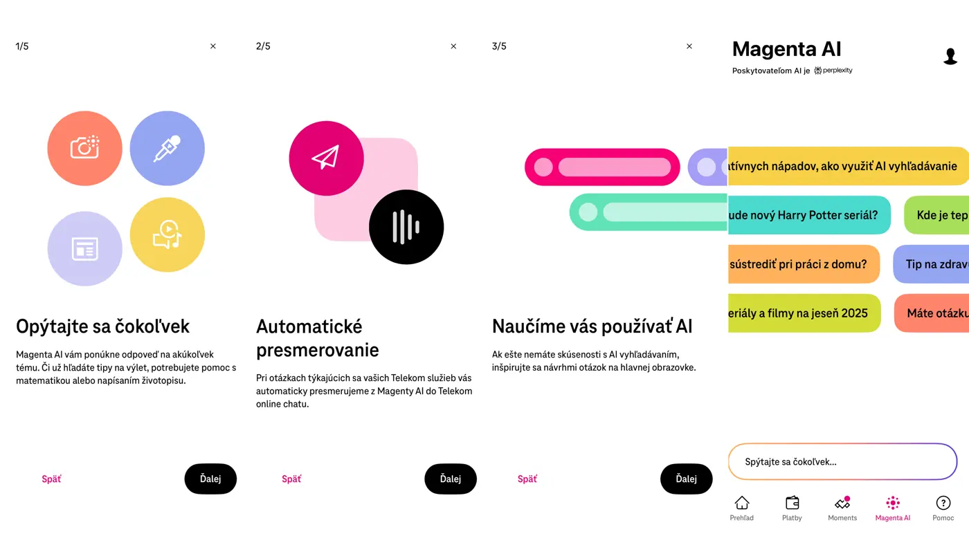 Operátor Slovak Telekom integroval umelú inteligenciu priamo do svojej mobilnej aplikácie pre Android a iOS. Najnovšia verzia aplikácie, ktorá je dostupná od prvej polovice augusta 2025, prináša novú sekciu s názvom Magenta AI. Dostupná je pre všetkých zákazníkov Telekomu bez akýchkoľvek obmedzení.