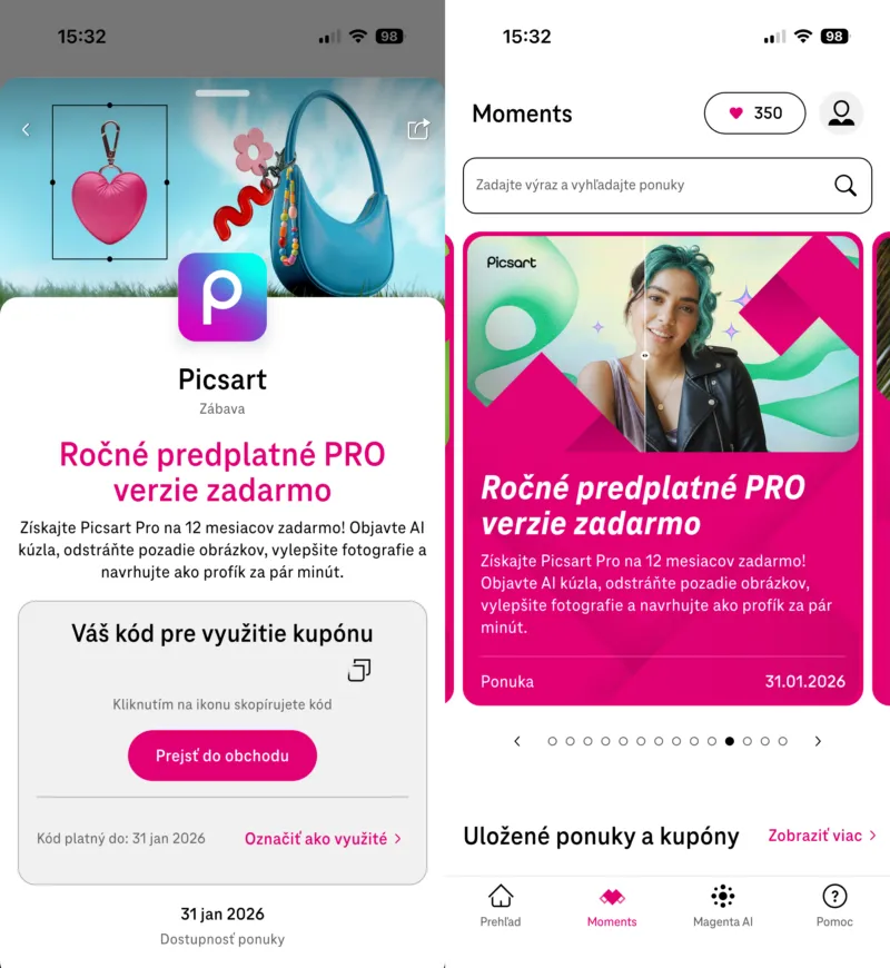 Telekom rozšíril obľúbený vernostný program Magenta Moments o novú várku ponúk. Používatelia mobilných a pevných služieb od Telekomu môžu počas januára využívať viacero digitálnych výhod. Hlavným lákadlom je exkluzívny prístup k prémiovej službe PicsArt Pro. Ročné predplatné si môžete bezplatne aktivovať v rámci Magenta Moments, a to len do konca mesiaca.