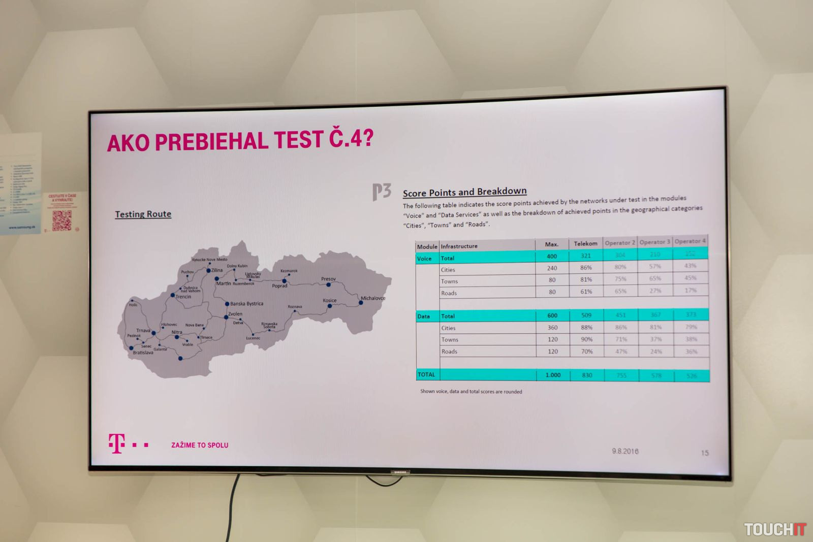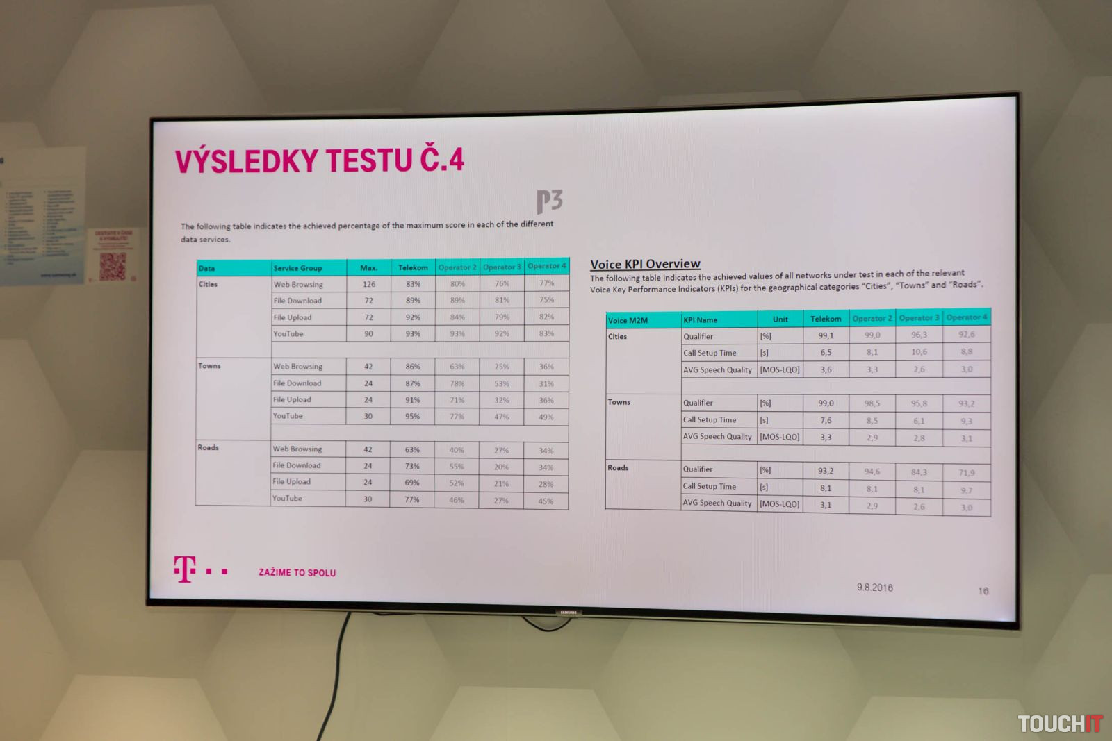 Štvrtýkrát po sebe víťazom testu P3 Communications Nezávislá spoločnosť P3 Communications, ktorá sa špecializuje na meranie dátových a hlasových služieb operátorov, v júli vykonala ďalšie merania na Slovensku. Testovanie prebiehalo na inej trase ako v prípade predchádzajúcich meraní. Takisto použila nové zariadenia na testovanie a celkovo prísnejšie metodiky merania. Víťazom sa stal opäť Slovak Telekom. Uspel v hlasových aj dátových službách a zároveň je jediným slovenským operátorom, ktorý získal ocenenie Best in Test od P3 Communications po štvrtý raz po sebe za dva roky. Detailnú správu s výsledkami testov nájdete na oficiálnom webe spoločnosti.Detailné výsledky správy nájdete na webe P3 Communications