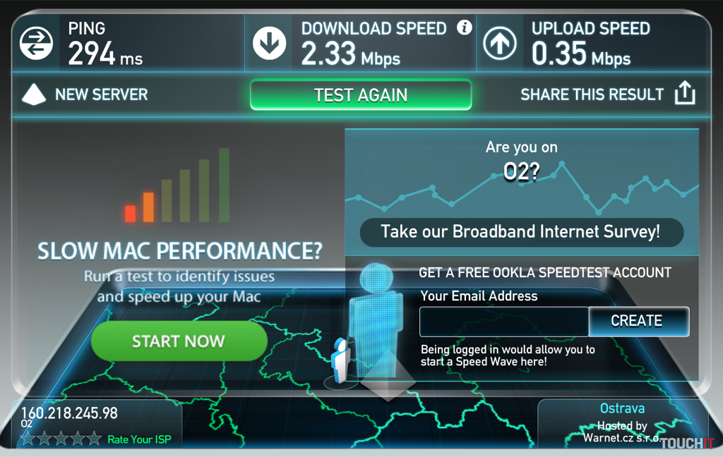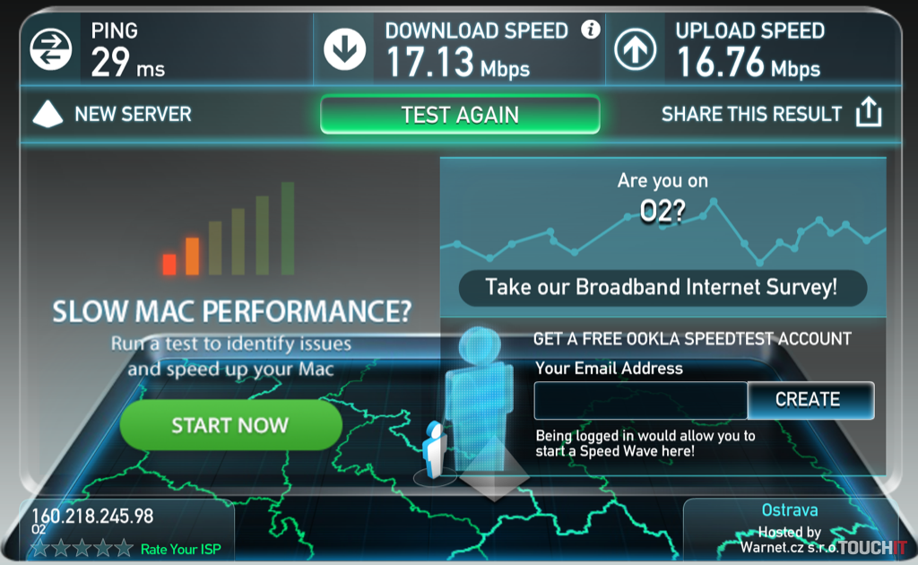 Smerová Wi-Fi anténa šíri signál do celého vozňa rovnomerne„Test rýchlosti a stability pripojenia v plnej prevádzke dopadol veľmi dobre, hovorí za to aj fakt, že počas jazdy súpravy, mimo stanice, sme boli schopní stiahnuť 900 MB súbor za menej než 4 minúty. Vo vozni sa nachádzalo mnoho ďalších cestujúcich, a taktiež viacero novinárov. Latencia, teda oneskorenie, bola taktiež na prijateľnej úrovni, väčšinou porovnateľná s bežným domácim Wi-Fi pripojením“
