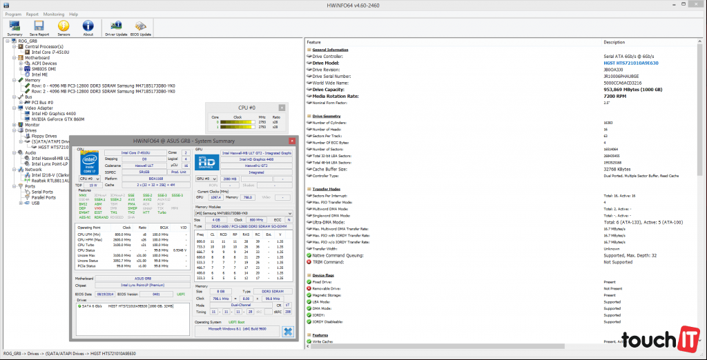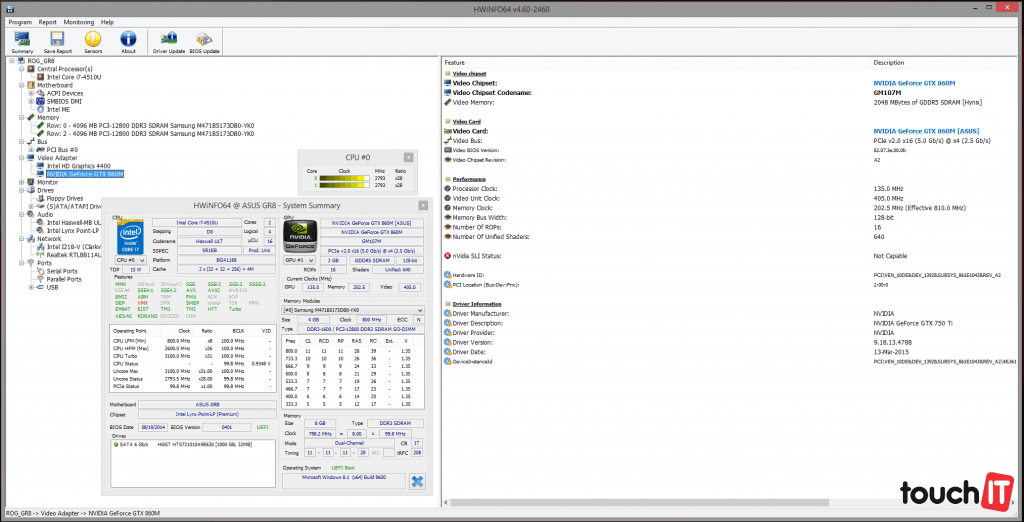 ASUS ROG GR8 má atraktívne rozmery 245 × 238 × 60 mm a hmotnosť iba 1,28 kg. Vďaka tomu je toto zariadenie výborne prenášateľné, čo oceníte, ak nepotrebujete herný notebook na cesty, avšak potrebujete počítač často nosiť z jedného miesta na druhé. Jednoducho ho zbalíte do batohu a problém je vyriešený. Pri pohľade na hardvérové parametre je zrejmé, akým spôsobom ASUS dosiahol kompaktný formát. Počítač v sebe obsahuje komponenty, ktoré nájdete prevažne v herných notebookoch. Konkrétne ide o nízkonapäťový procesor Intel Core i7-4510U so základnou frekvenciou 2,60 GHz. Procesor má dve jadrá a dopĺňa ho grafická karta, ktorá je v oficiálnych materiáloch označovaná ako GeForce GTX 750 Ti. Tento popis je zvýraznený aj vo vlastnostiach ovládačov, avšak 3DMark a ďalšie nástroje ju rozpoznali ako model GTX 860M. Môže ísť o softvérovú vadu.