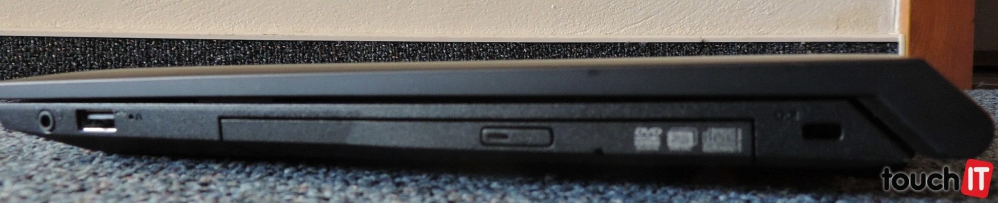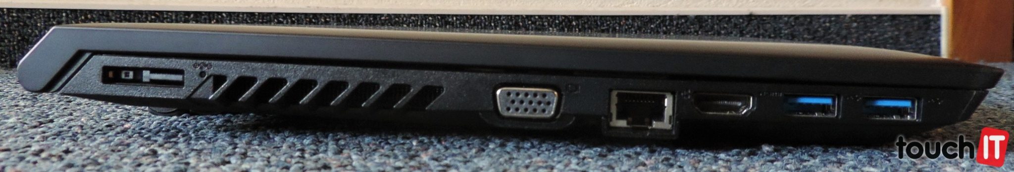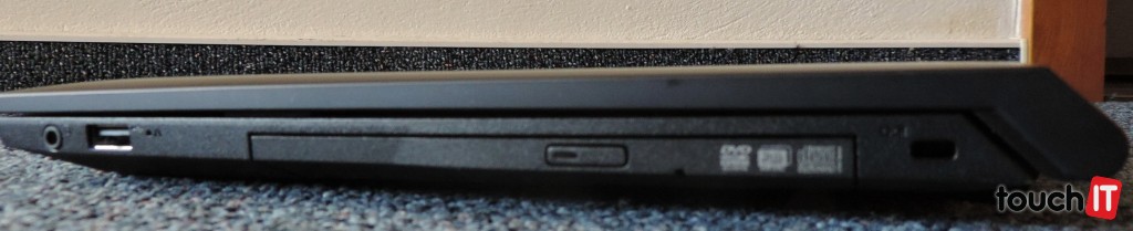 Pravú hranu obsadila optická mechanika, USB 2.0 port a audio konektor. Ľavá hrana má okrem výduchu v štandardných veľkostiach VGA, Eternet a HDMI konektor a dva USB 3.0 porty. Čítačka SD kariet je na prednej hrane vľavo.