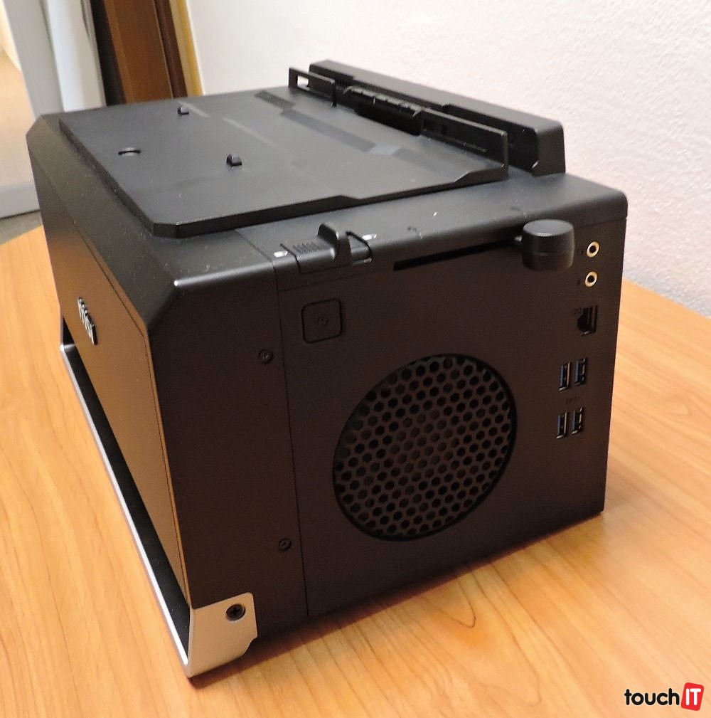 Dokovacia stanica má unikátny tvar, ktorý pripomína reproduktor. A túto funkciu aj ponúka. Okrem iného obsahuje 2 × 5W reproduktor a jeden 5W woofer. Notebook položíte na hornú podložku a s dokom ho prepojíte pomocou pomerne širokého konektora. Na bočnej strane nájdete tlačidlo pre zapnutie / vypnutie počítača (