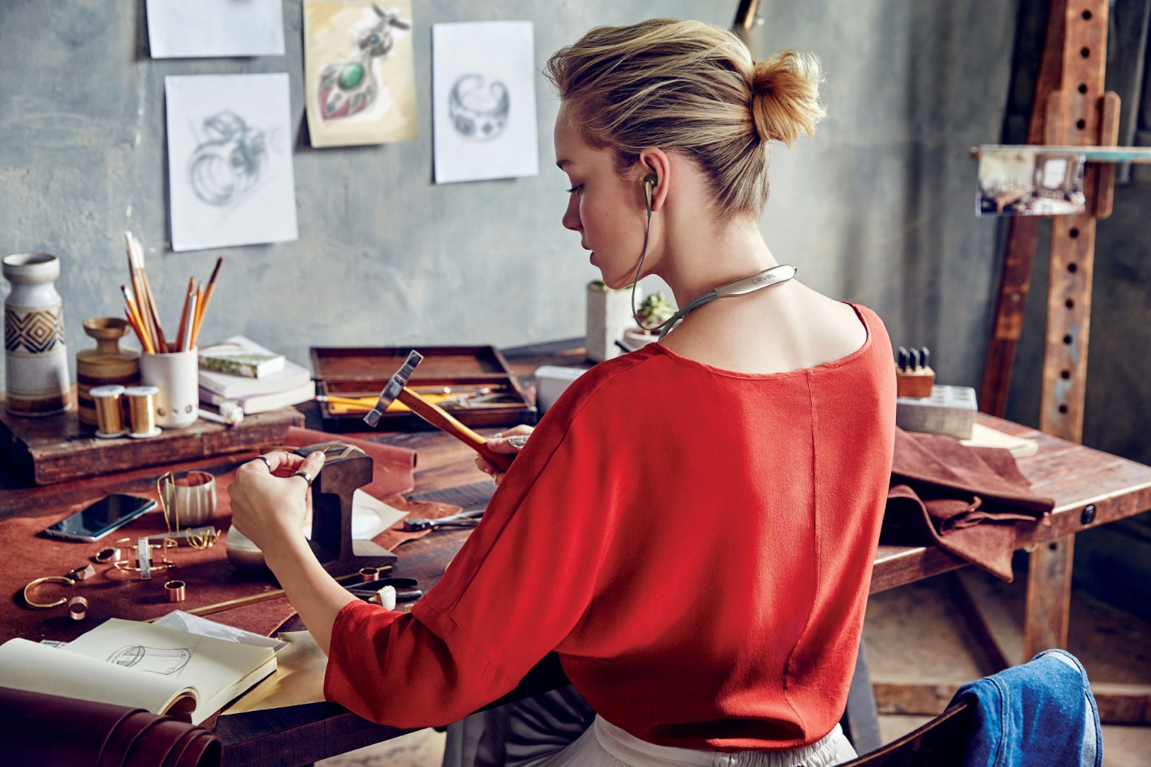 Vyhotovenie je unikátne v tom, že hlavná časť tela bezdrôtových slúchadiel je umiestnená v záhlavnom pruhu z plastu. Dostupné sú štyri farebné varianty, na Slovensku budú dostupné tri – tmavomodrá, zlatá a biela. Bledomodrá nie je určená pre náš trh. Spojovací most je lesklý a hladký a z plastového materiálu prechádza do pružnej gumy. Tá sa zachytí na košeli alebo na tele a slúchadlá držia na krku aj počas chôdze. Z nich potom vedú samostatné káble pre ľavý a pravý reproduktor. Na nich sú in-ear mušle s umiestnením do ucha. V balení nájdete aj tzv. stabilizačné návleky. Bez nich vám totiž budú slúchadlá z ucha vypadávať aj v sede pri počítači, po pár krokov vám mušle určite vypadnú z ucha. Toto je ten typ slúchadiel, ktoré buď vám sedia, alebo nie. Pred kúpou ich treba určite vyskúšať, aby ste zistili, ako vám sedia v uchu.
