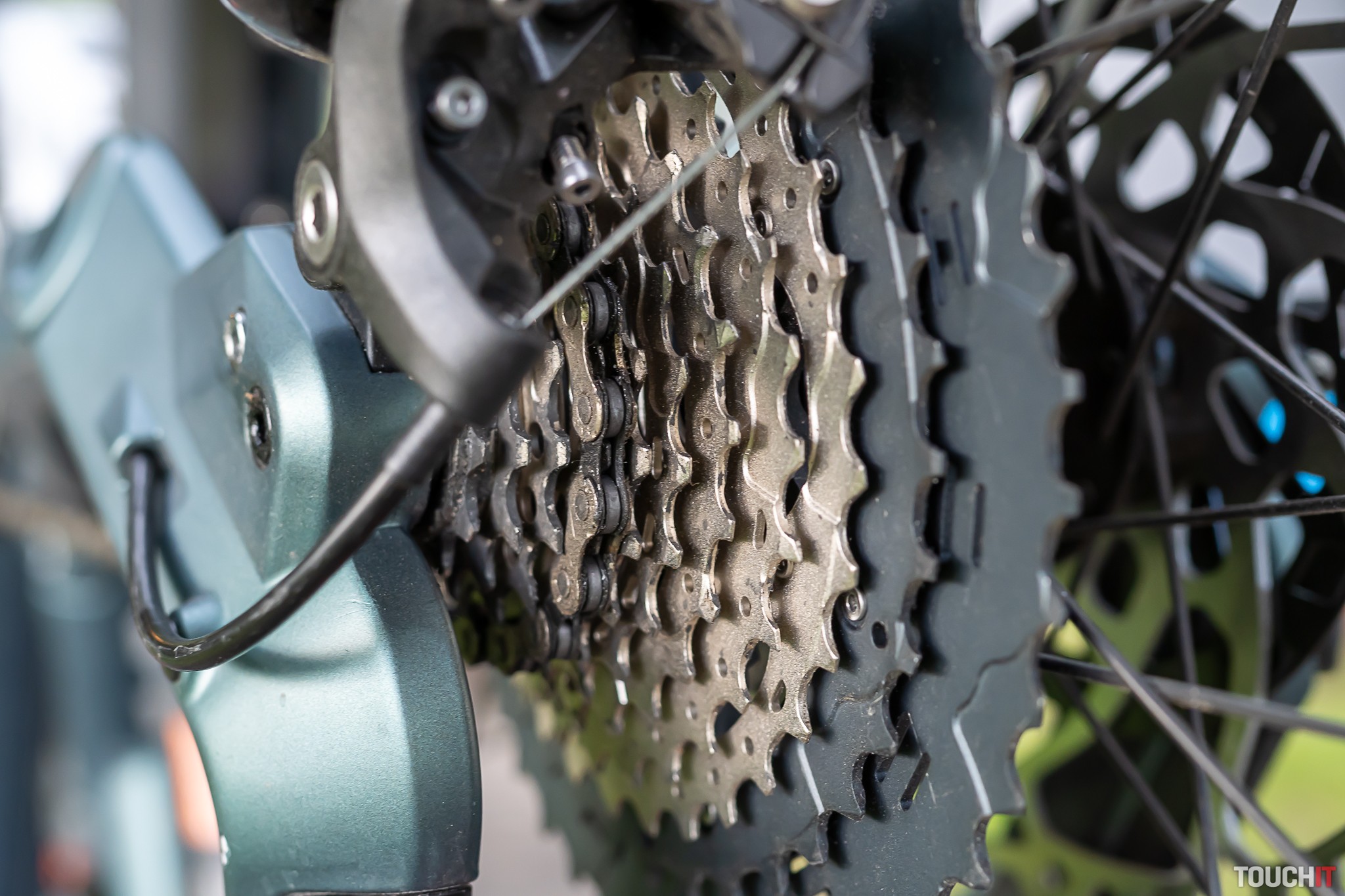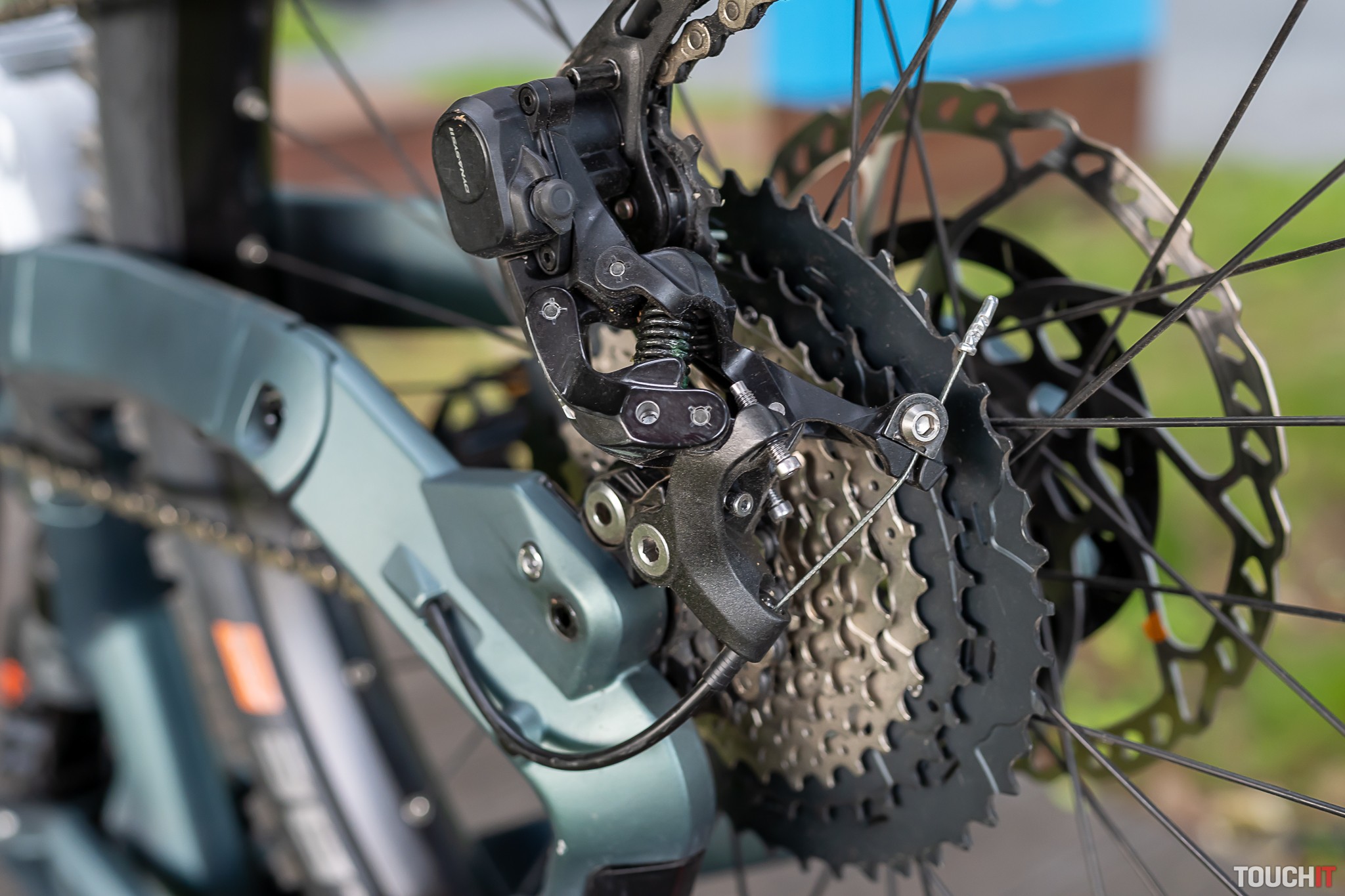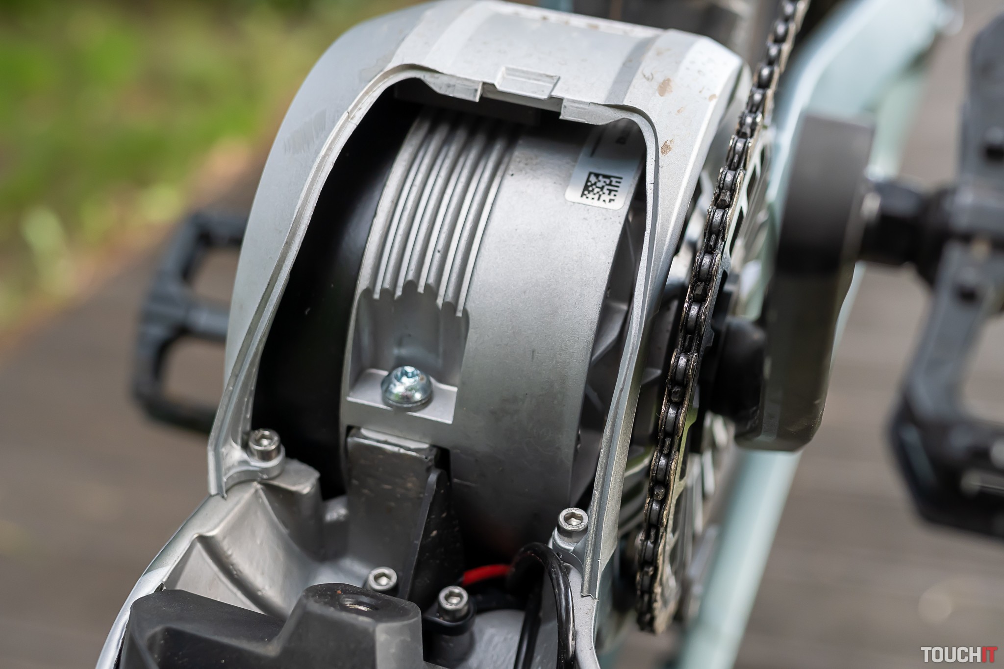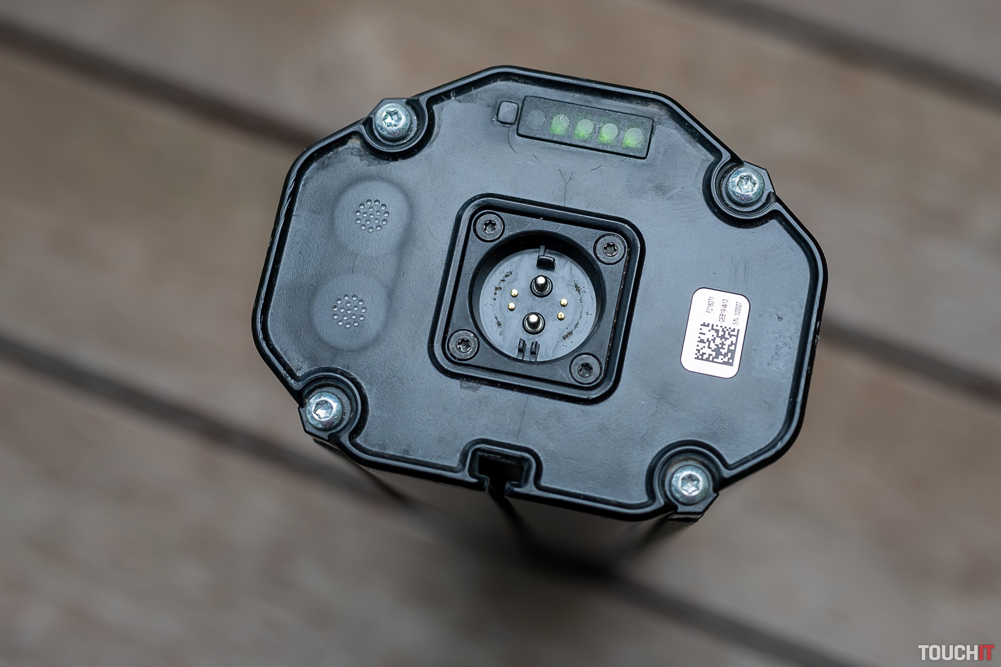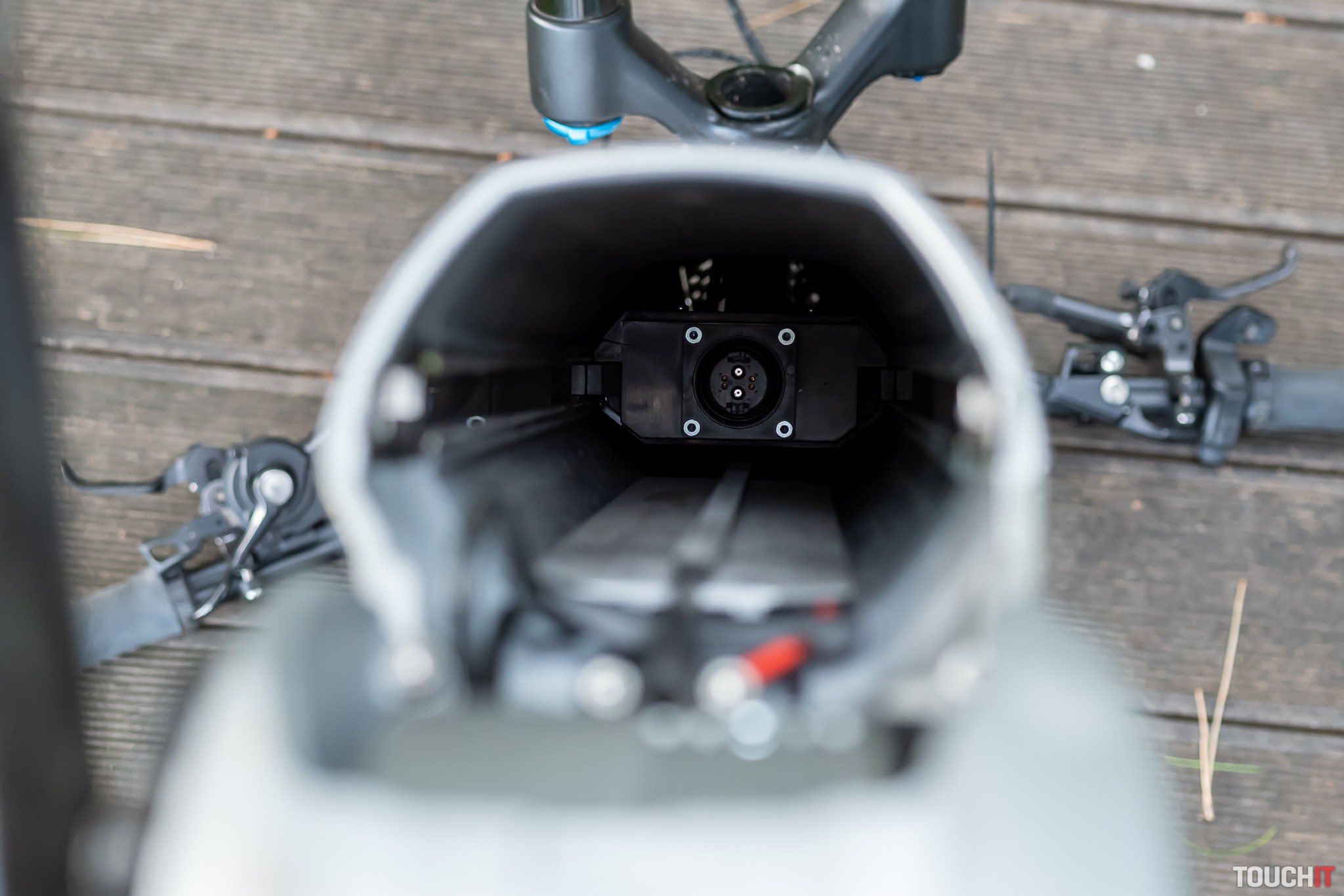 Zospodu je motor chránený krytom z vystuženého plastu a tu je aj priestor, kde sa dá dostať k vysokokapacitnej batérii. Tá sa vyťahuje z tela bicykla pomerne náročne ale vtedy ju môžete nabíjať mimo bicykla, napr. v kancelárii alebo doma. Zostávajúcu kapacitu batérie je možné skontrolovať pomocou dotykového senzora priamo na batérii. Súčasťou dodávky je 4A nabíjačka, nabíjanie batérie s ňou trvá okolo 8 hodín. Dokúpiť sa dá aj 10 A nabíjačka, ktorá nabije úplne prázdnu batériu na 80 % kapacity už za 60 minút. Jej cena je okolo 390 eur, nabíjali sme s ňou v predajni eBajk.sk.
