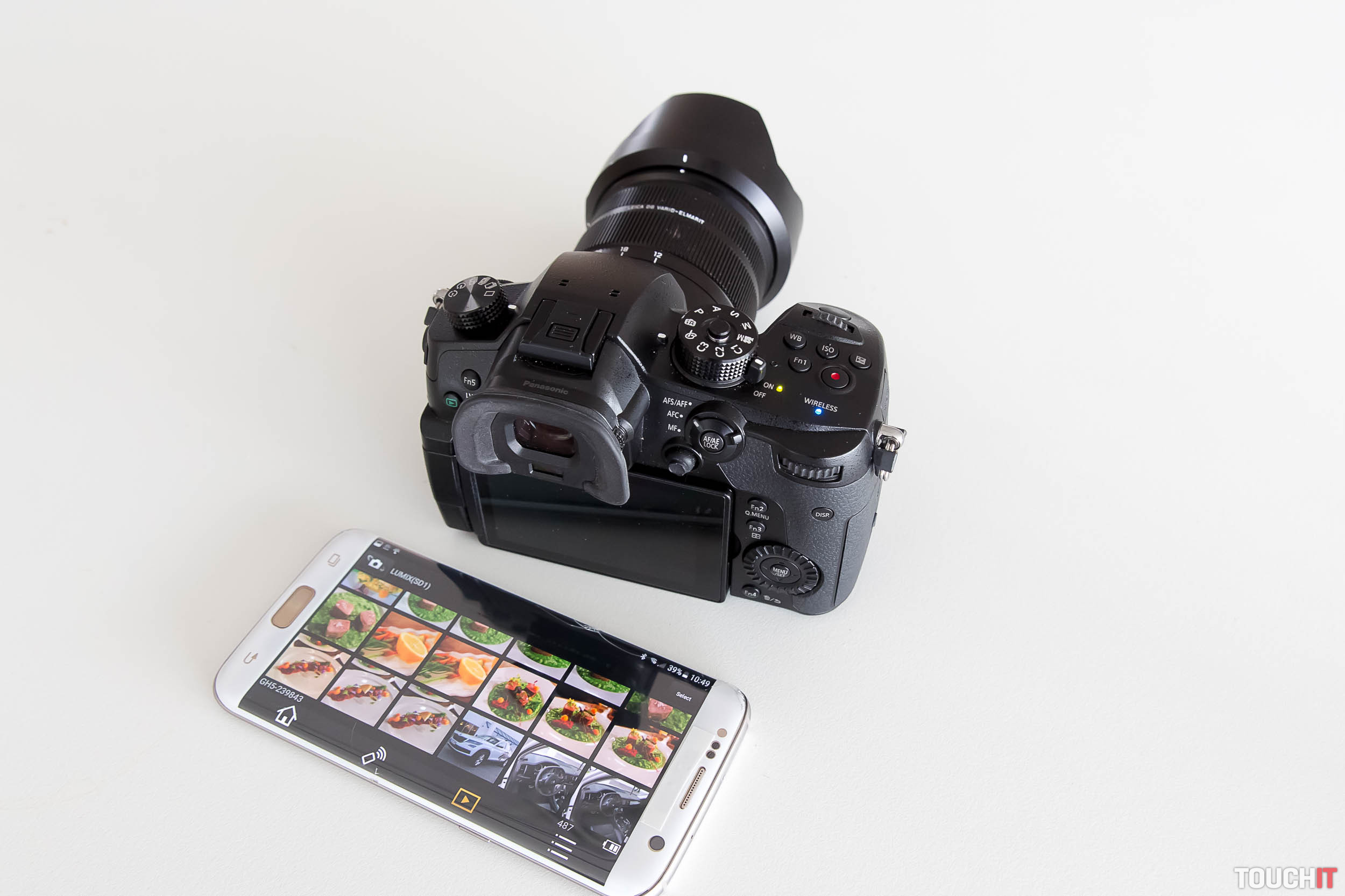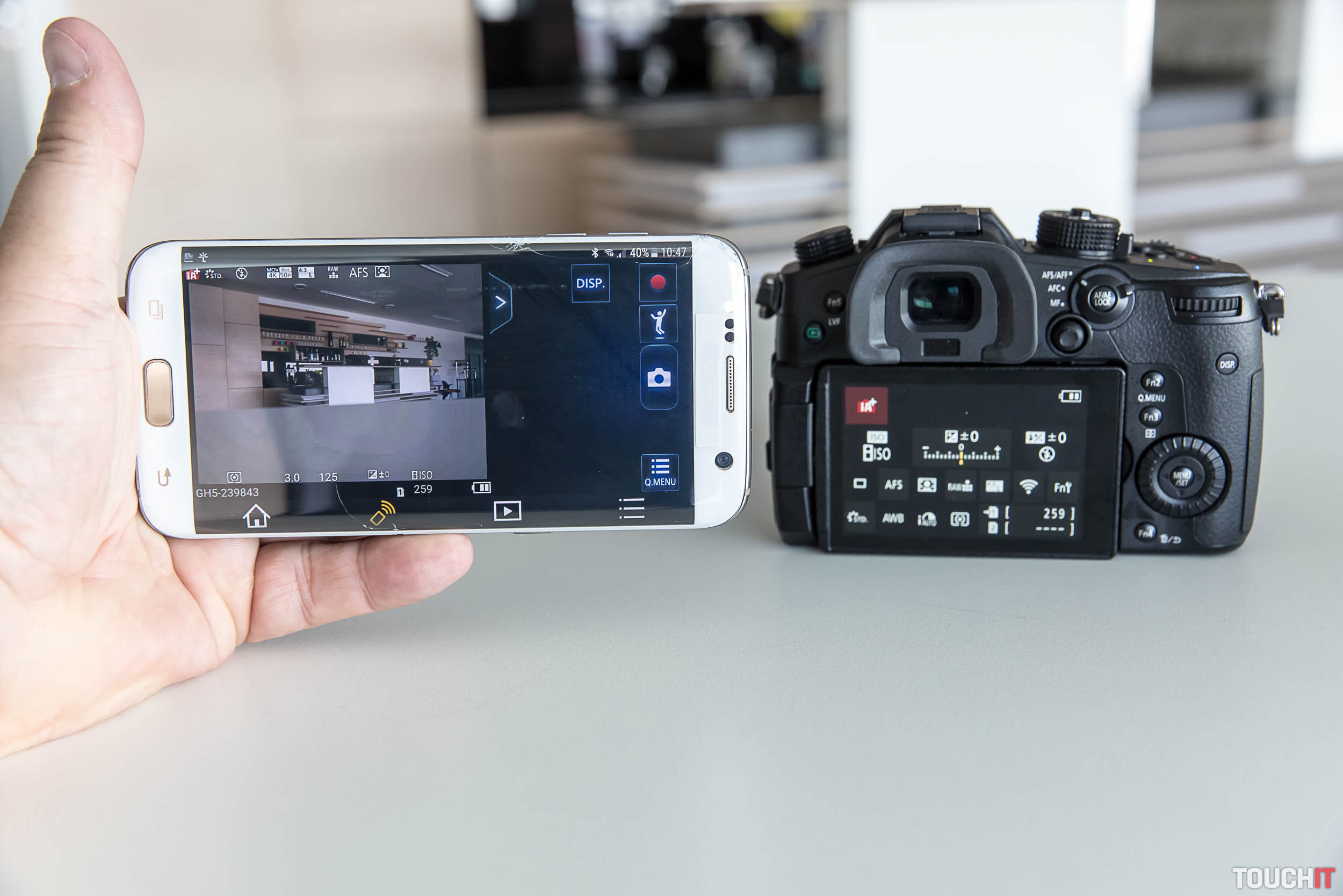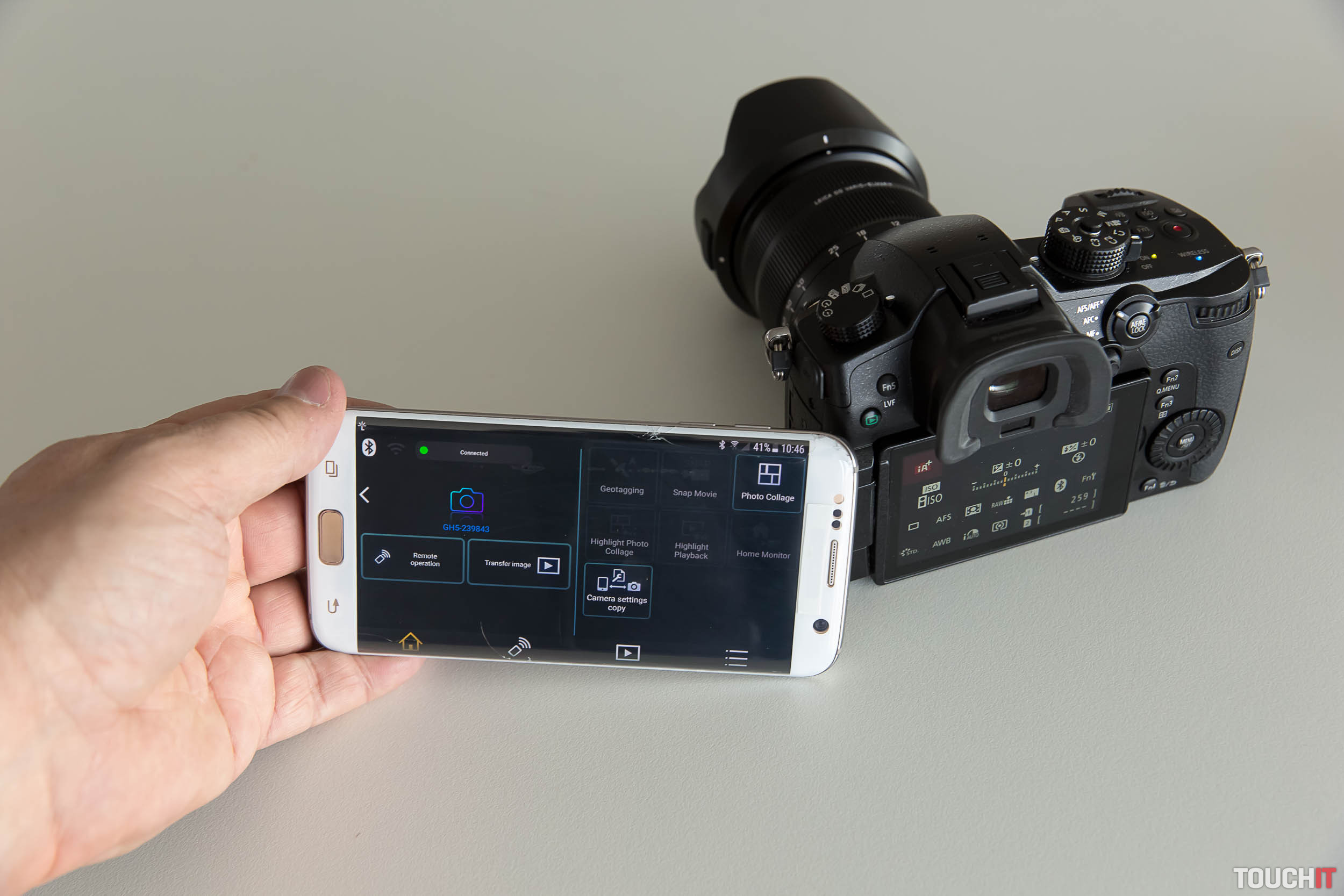 Ako je to dnes trendom, aj LUMIX GH5 má vo výbave Bluetooth a Wi-Fi. V rámci aplikácie Panasonic Image App môžete tak nastaviť ovládanie fotoaparátu, realizovať fotky smartfónom v podobe diaľkového ovládača a sťahovať fotky do telefónu alebo tabletu (ale len formát JPG). Na rýchle párovanie BT pripojenia môžete použiť aj NFC snímač. Tiež je možné s pripojením na Wi-Fi odosielať fotografie na Cloud. Aplikácia by mohla mať trochu lepšie rozhranie, je tu vidno taký japonský prístup k softvéru a tiež sa nám občas prerušilo spojenie.