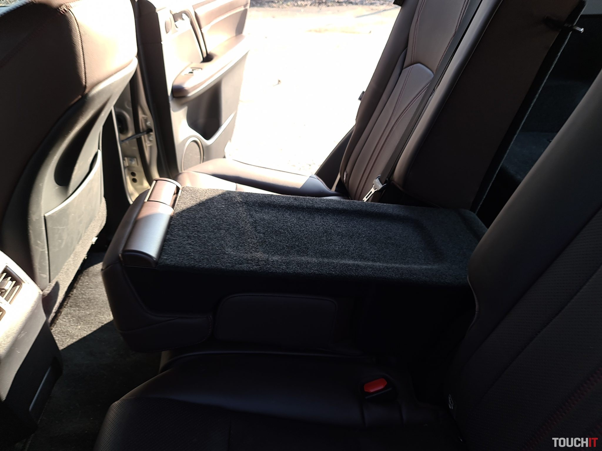 Medzi sedačkami v druhom rade je aj lakťová opierka, ktorá obsahuje úložný priestor a je tu aj držiak nápojov. Rovnako sa tu dá nastaviť vyhrievanie sedadiel a k dispozícii sú aj dva USB porty na nabíjanie mobilných zariadení.