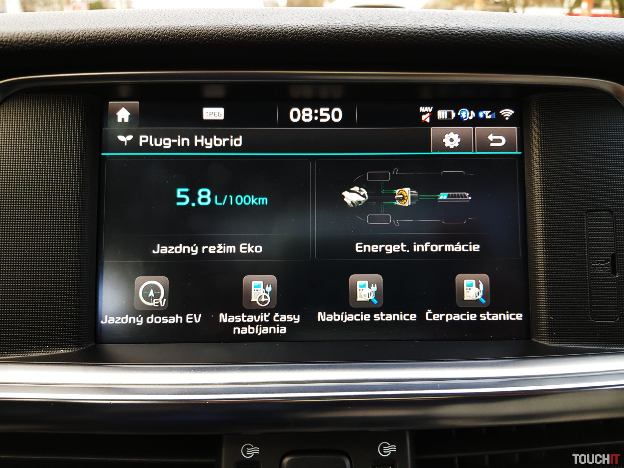 Pohľad na technologickú výbavu je veľmi podobný, začo od nás získala Optima PHEV pochvalu. Informačno-zábavný systém je sústredený v strede palubovky, s jemnou orientáciou na vodiča. Dotykový LCD displej má veľkosť 8“-palcov a veľmi dobrú odozvu, bez výrazných omeškaní. Tomuto displeju sekunduje menší, 4,3“-palcový displej pred vodičom, kde máte pod dohľadom asistenčné systémy, informácie o automobile, a taktiež tu množstvo funkcií nastavujete. K nastaveniam neodmysliteľne patrí multifunkčný volant, ktorý dobre sadne do ruky a všetky ovládacie prvky sú na dosah prstov. Z volantu sa ovládajú aj asistenčné systémy. Zo softvérových nadstavieb a konektivity nechýba Apple CarPlay, Android Auto, Wi-Fi (zdieľanie z iného zariadenia do auta), Bluetooth a niekoľko aplikácií (počasie, dopravné informácie, radary, a pod.). Vo výbave je zakomponovaná aj navigácia, ktorá pracovala bezproblémovo. Mapové podklady sú od spoločnosti TomTom. Použiť je možné aj základnú mobilnú aplikáciu – MyKIA, ktorá je pre iOSAndroid zariadenia zdarma. Ponúka iba možnosť vyhľadania servisu, prehľad ikon z prístrojovej dosky, rozpis údržby, a taktiež si pamätá poslednú polohu vozidla. Tú však čerpá zo smartfónu.