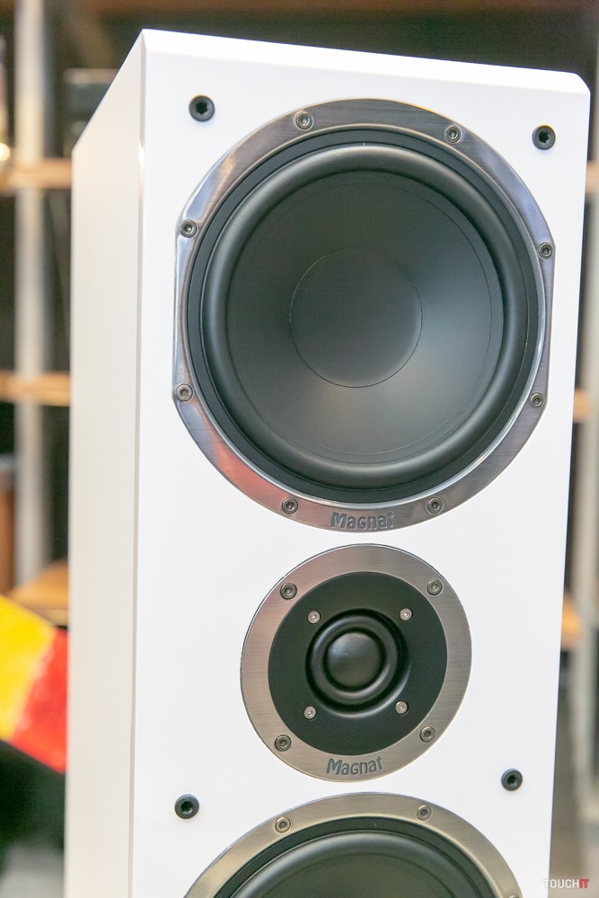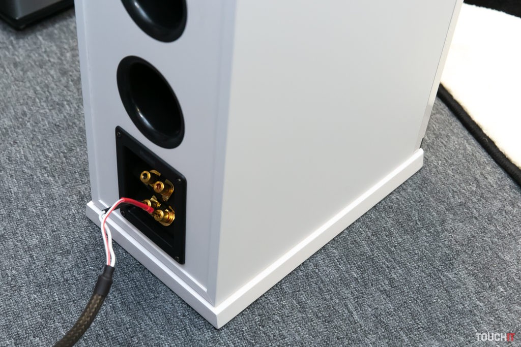 Reproduktory sú vyhotovené v jasno žiarivej bielej, alternatívne v klavírne čiernej farbe. Je to trojpásmová sústava s troma 170 mm basovými meničmi. Vzhľadom na rozmery je to výkonný reproduktor, páčilo sa nám štýlové vyhotovenie. Výrobca použil vysokokvalitné komponenty, okrem veľkých basových reproduktorov je tu aj 30 mm výškový reproduktor s priestorovým zvukom, jeho základom je feritové jadro.