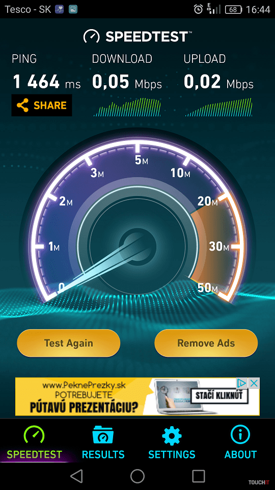 Deklarované rýchlosti mobilného internetu Tesco mobile Bodka, sú 8 Mbps príjem a 2 Mbps pre odosielanie dát. Rýchlu 4G / LTE sieť sme nemali a režim siete bol takmer neustále v 3G (HSPA+). V testovaných oblastiach sme namerali podstatné rozdiely v rýchlostiach internetu. V centre, východnej a južnej časti mesta pokojne surfujete v plných rýchlostiach, zatiaľ čo v severnej časti mesta bola rýchlosť už len 0,60 Mbps prijímanie a 0,50 Mbps pre odosielanie dát. Túto stratu s časti pripisujeme hustej zástavbe, vyšším priemyselným budovám v meranej zóne, to je ale náš subjektívny názor. V okolitých dedinách boli rýchlosti internetu v priemere od 0,50 Mbps do 1,5 Mbps prijímanie a 0,75 Mbps pre odosielanie. V jednej lokalite, ktorá je v údolí, to bolo len 0,05 Mbps prijímanie a 0,02 Mbps pre odosielanie v režime siete 2G. Tu majú problém ale aj Telekom a Orange. Lokality v smere na Nitru boli bezproblémové a internet tu dosahoval deklarované rýchlosti.