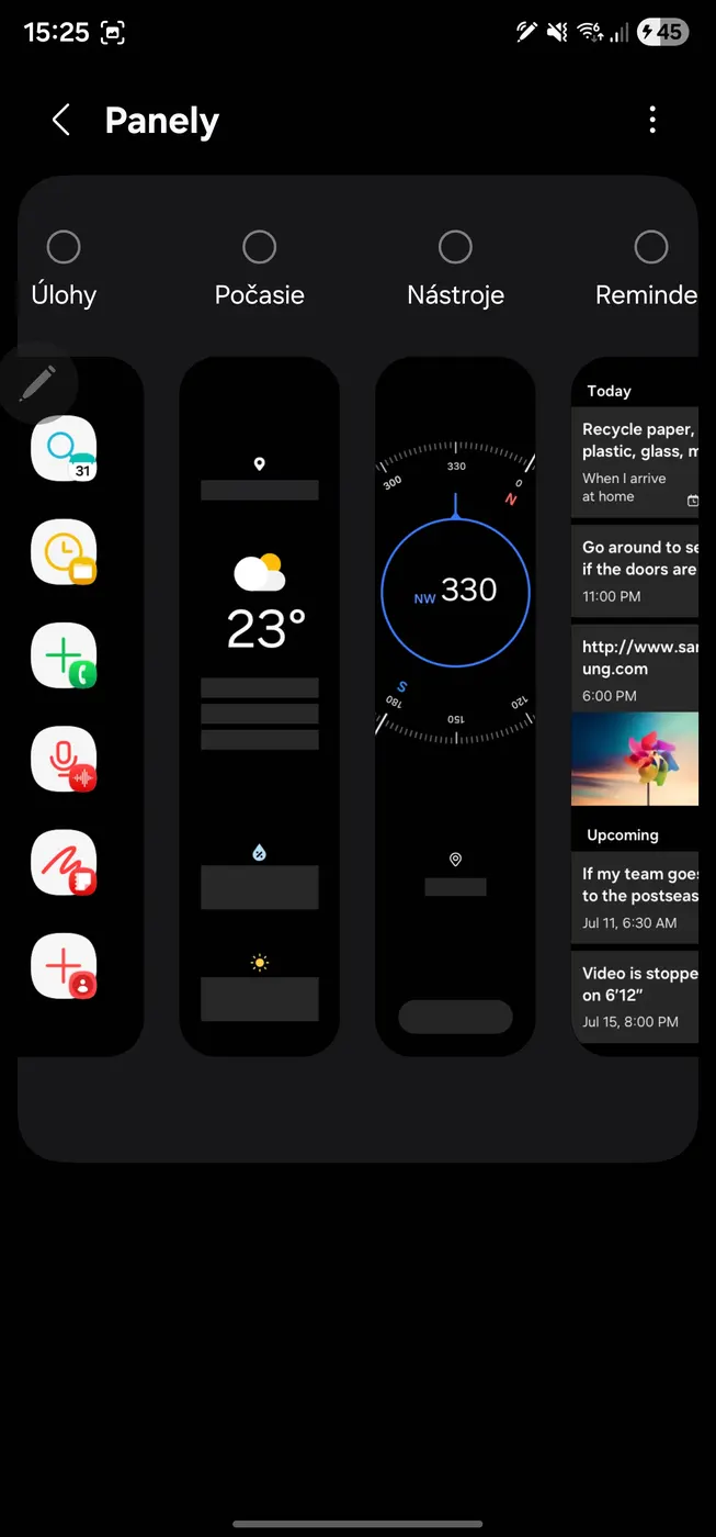 - Vyskúšajte rôzne panely – Edge Panels podporujú rôzne druhy obsahu, vyberte si tie, ktoré najviac zjednodušia vašu každodennú prácu.