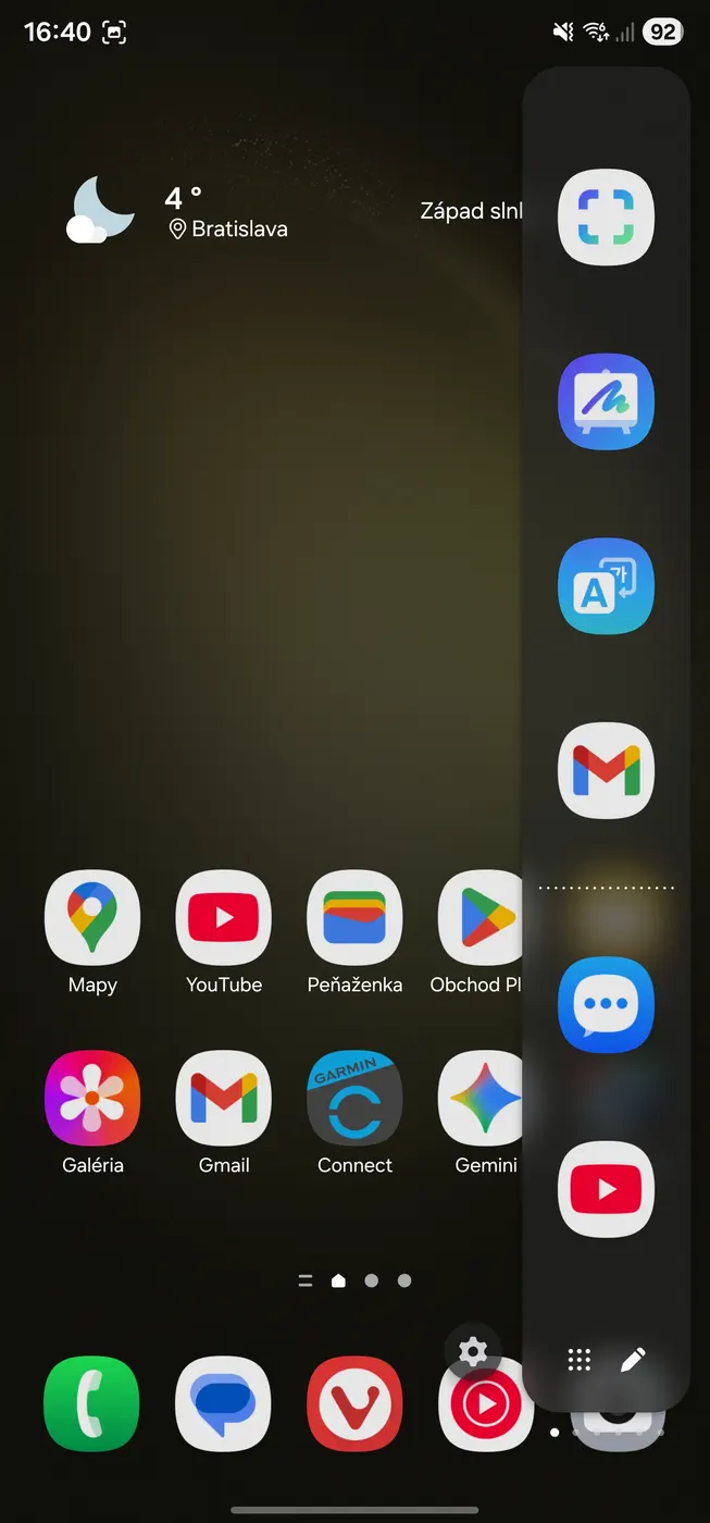 Bočné panely vyvoláte jednoduchým potiahnutím z okraja obrazovky. Predstavujú robustné riešenie, ktoré si môžete prispôsobiť podľa vlastných potrieb tak, aby ponúkali rýchly prístup k často používaným aplikáciám, kontaktom, widgetom či nástrojom ako kalkulačka, záznamník obrazovky alebo funkcia Výber pomocou umelej inteligencie na rýchle kopírovanie textu a obrázkov.