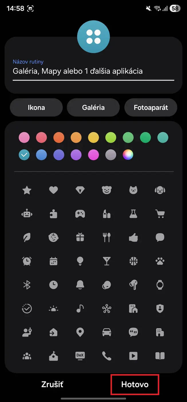- Kliknite na Uložiť, pomenujte rutinu (napr. „Inteligentné otáčanie“) a vyberte si ikonu.