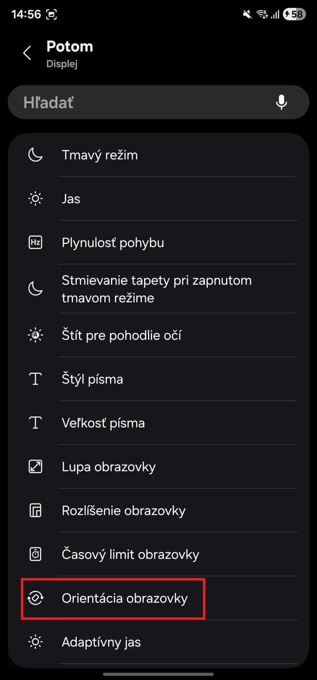 - Vyberte „Orientácia“ alebo choďte do sekcie Displej -> Orientácia obrazovky.