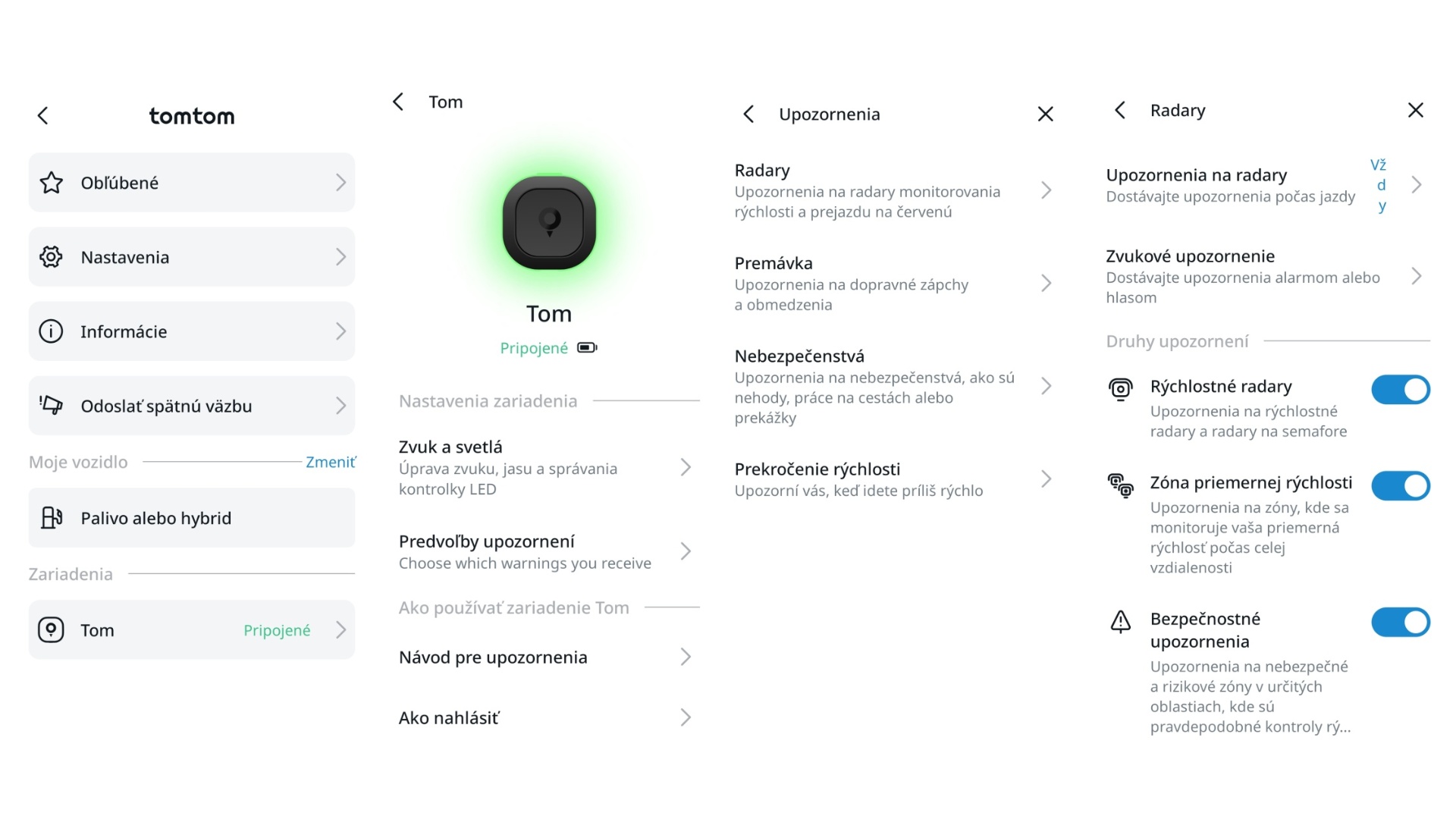 Ako bude celé zariadenie Tom fungovať si môžete nastaviť priamo v mobilnej aplikácii. Napr. môžete vypnúť hlásenie o prekročením maximálnej povolenej rýchlosti, nastaviť intenzitu hlasitosti, jas a samozrejme aj aktualizovať celé zariadenie.