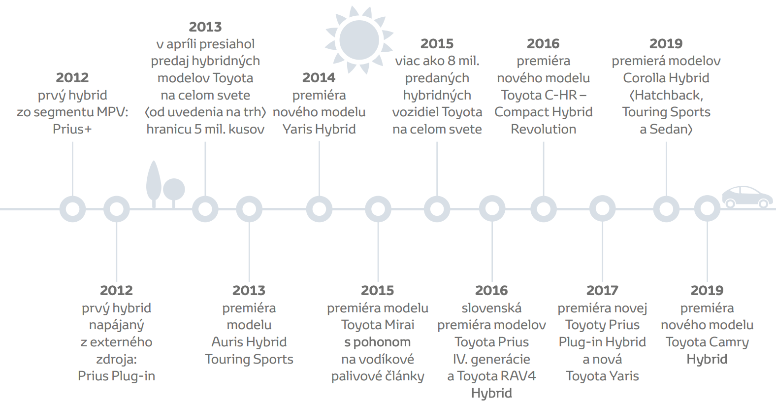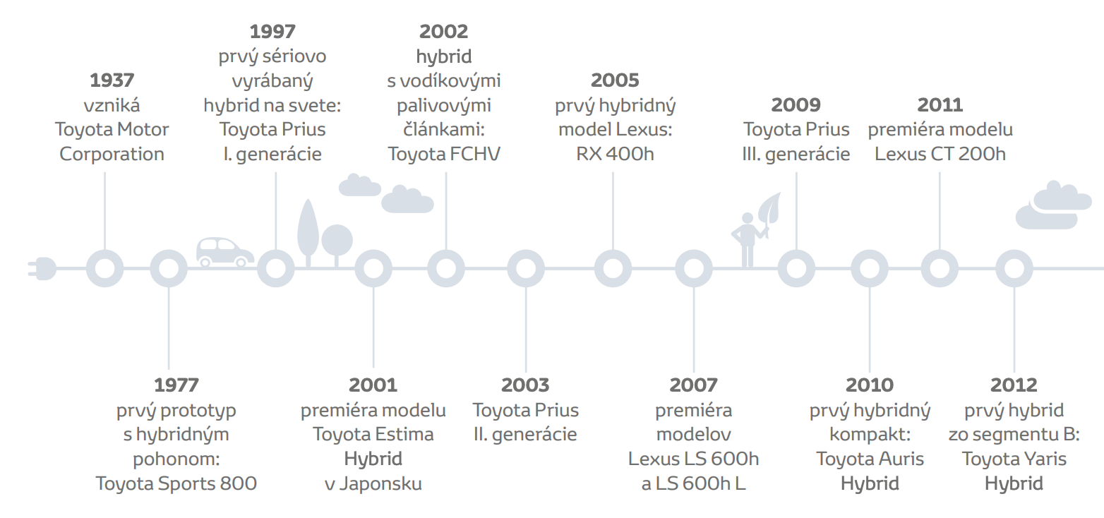 Aktuálne má Toyota v ponuke 36 modelov s hybridným pohonom (celosvetovo) a od roku 1997 predala táto automobilka viac ako 15 miliónov hybridných vozidiel, čo vôbec nie je málo. Aby ste mali predstavu ako sa to celé vyvíjalo, tak si pozrite jednoduchú časovú os, na ktorej sú vyznačené najdôležitejšie míľniky značky.