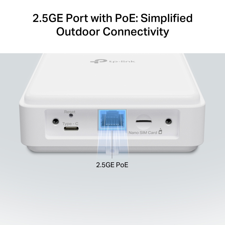 Zariadenie disponuje 2,5 Gb/s PoE/LAN portom, ktorý umožňuje prenos dát aj napájania prostredníctvom jedného kábla. Podporované je štandardné PoE 802.3af/at aj pasívne 48V PoE, čo zjednodušuje nasadenie v lokalitách bez priameho prístupu k elektrickej sieti. V balení sa nachádza desaťmetrový ethernetový kábel, PoE adaptér a všetko pre montáž zariadenia.