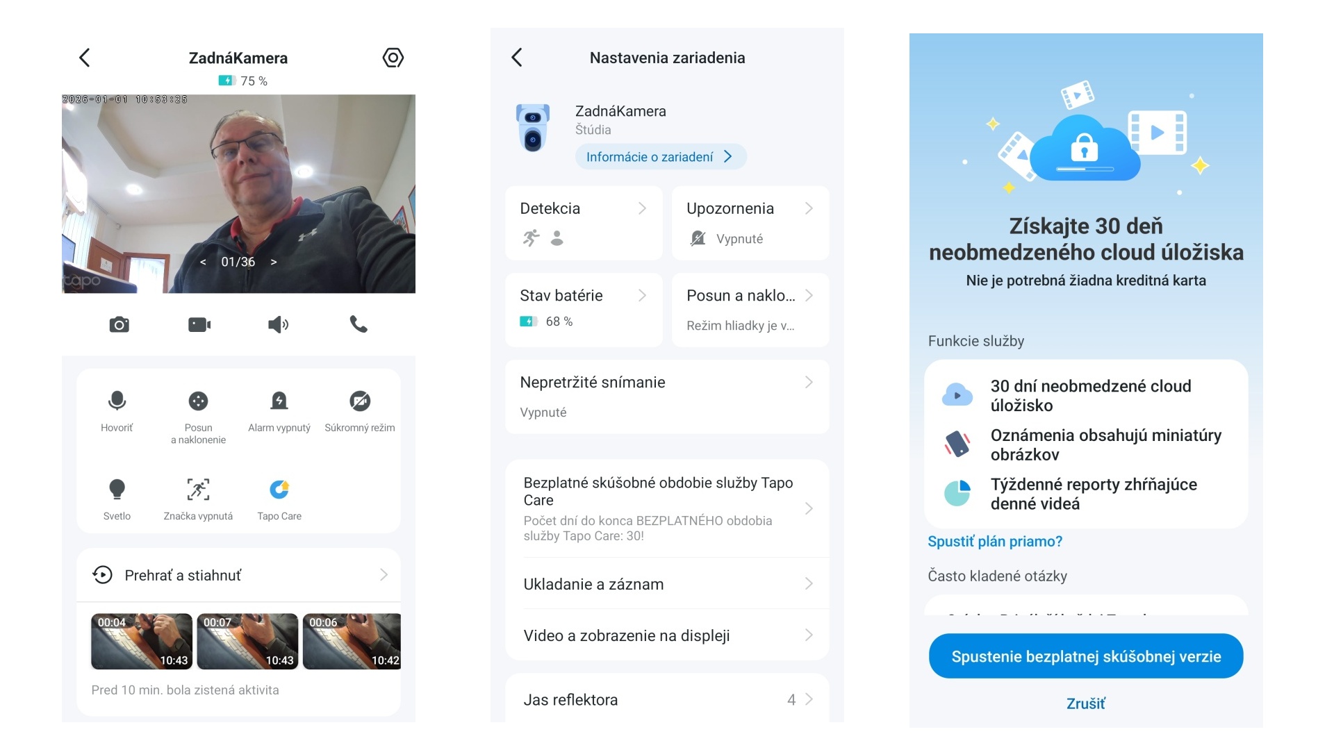 Záznamy je možné ukladať lokálne na microSD kartu s kapacitou od 8 do 512 GB alebo využiť cloudovú službu Tapo Care. Ide o platenú službu, na 30 dní od začiatku inštalácie máte túto službu na vyskúšanie zadarmo. Pre náročnejších používateľov je zaujímavá aj kompatibilita so zariadením Tapo H500, ktoré pridáva lokálne úložisko, možnosť rozšírenia pomocou SATA disku a pokročilé funkcie ako rozpoznávanie tvárí.
