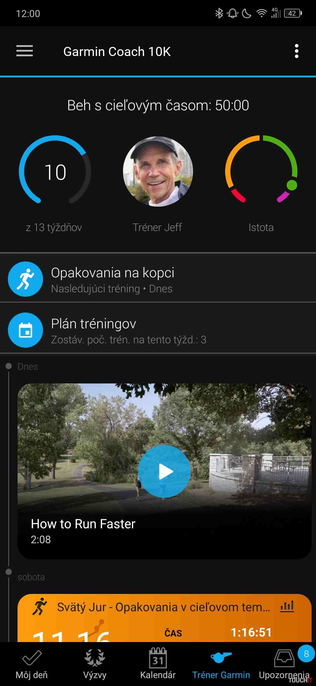 Odporúčam pridať Trénera Garmin do spodnej lišty mobilnej aplikácie, aby ste mali okamžitý prístup k tejto funkcii. V aplikácii Garmin Connect je potrebné pri vytváraní tréningového plánu zadať cieľ, ktorý chcete dosiahnuť. Tréningový plán síce trvá niekoľko týždňov až mesiacov (dĺžka je individuálna), no počas nich sa tréning bude prispôsobovať podľa krátkodobo dosahovaných cieľov. Nemáte tak na dlhé obdobie vytvorený plán, ktorý nemusí priniesť požadovaný efekt. Cvičenia je vidieť iba na približne dva týždne dopredu (niekedy aj menej), pretože plán sa adaptívne mení. Na trénovanie si vyberte aspoň tri dni v týždni, kedy vám bude tréning vyhovovať. Aj z tohto dôvodu je celý tréningový proces veľmi efektívny. V prípade, že sa vám bude dariť, Tréner vás dokáže posunúť ešte ďalej. Počas tréningov o tom informuje farebný kruhový graf, takže je presne vidieť, či náhodou nezaostávate za stanoveným cieľom, alebo či sa vám ho darí prekonávať.Na začiatku si určite cieľ, o ktorom ste sami presvedčení, že ho dosiahnete, ale bude vo vašom tréningu znamenať pokrok. V druhej polovici plánu bude Tréner Garmin pomerne nekompromisný, o čom sa už v týchto dňoch presviedčam, keďže do konca plánu mi chýbajú už iba 4 týždne. V mojom prípade som si stanovil cieľový čas 50 minút na 10 km dlhý beh. Viem, že tento čas nebol pre mňa v minulosti problém, takže rád si ho zopakujem aj teraz. Jedinou prekážkou na začiatku tréningového plánu boli prebytočné kilogramy a slabá kondícia.Zmena plánu? Tréner Garmin sa prispôsobí