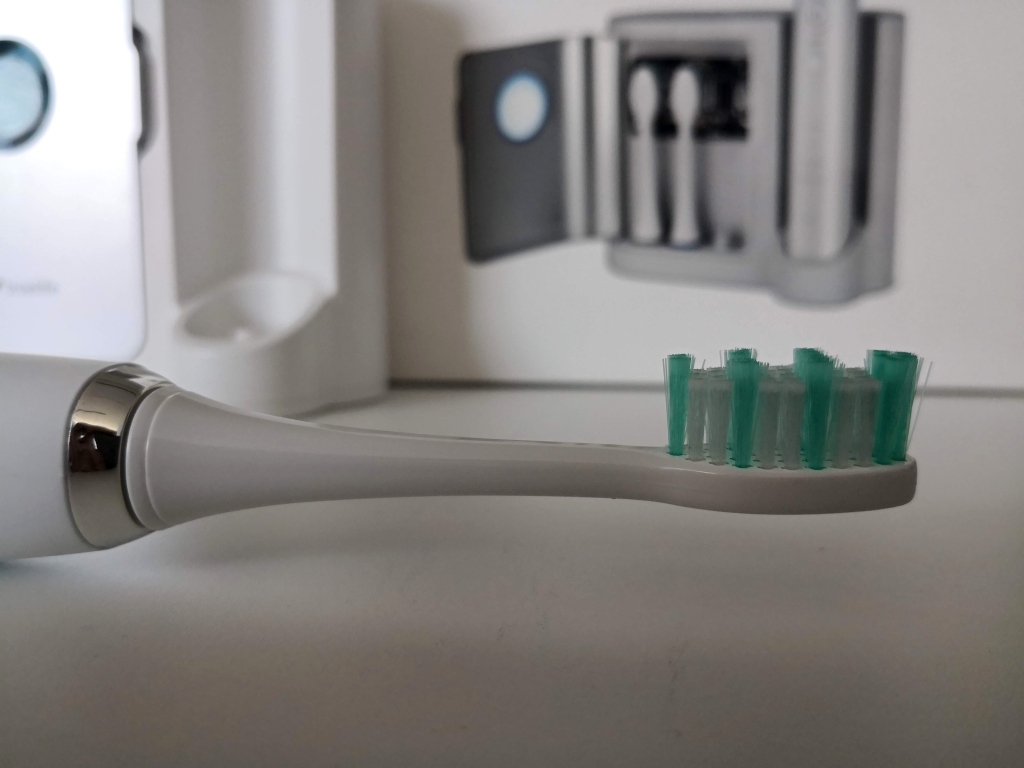 Zubná kefka má jednoduchý dizajn. Vyrobená je z bieleho matného plastu. Na jej tele sú dve tlačidlá. Hlavným tlačidlom kefku spustíte a menším tlačidlom si vyberiete jeden zo štyroch čistiacich režimov (klasický, jemný, bieliaci a masáž ďasien). Každý cyklus trvá dve minúty so štyrmi 30 sekundovými časovými intervalmi, ktoré sú signalizované krátkym prerušením. Počas nich by ste si mali vždy vyčistiť jednu štvrtinu chrupu. Čistenie zubov sonickou zubnou kefkou je úplne iný zážitok v porovnaní s obyčajnou manuálnou zubnou kefkou, alebo elektrickou oscilačnou kefkou. Ak ste v tomto smere začiatočník, môžete počas prvých čistení cítiť jemné šteklenie. To však po niekoľkých čisteniach pominie. Navyše výsledky čistenia budú citeľné. Je to síce subjektívne hodnotenie, no najlepšie sa o tom presvedčíte, keď takúto kefku začnete pravidelne používať.Obsah balenia a funkcia navyše