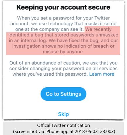 Twitter tvrdí, že chyba je už opravená a že nič nenasvedčuje tomu, že by došlo k nejakému zneužitiu alebo narušenia dát. Odporúča len, aby používatelia „zmenu svojho hesla zvážili.“