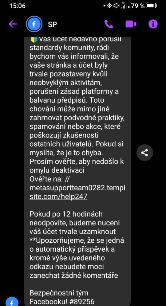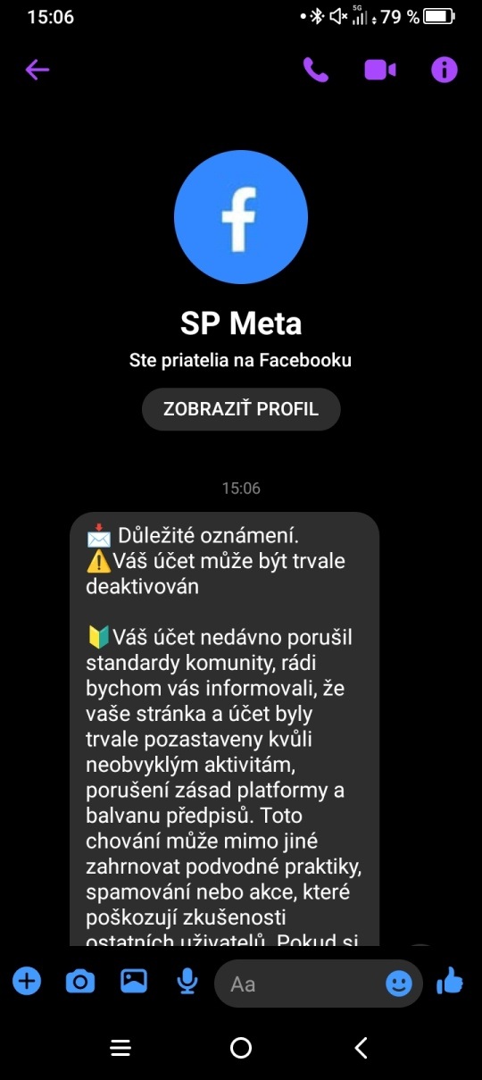 Falošná správa, ktorú v posledných dňoch používatelia dostali, apeluje na vykonanie akcie. Ako inak, vždy je potrebné, aby používateľ vykonal nejakú akciu a podvodníkom otvoril dvere do svojho účtu. Falošné oznámenie prišlo ako správa od používateľa SP Meta. Je v češtine, čo znamená, že ide o cielený podvod na náš región.